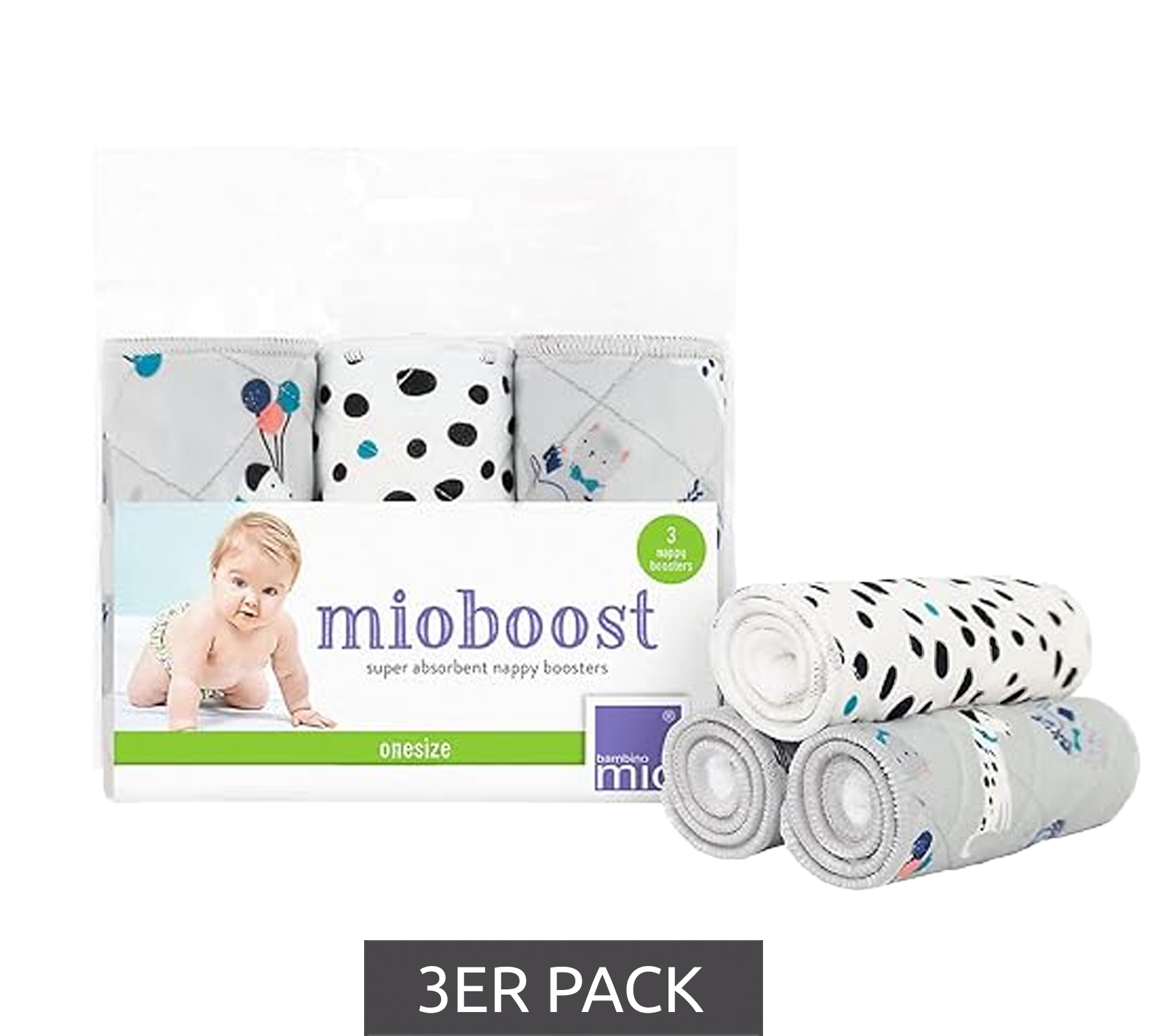 Lot de 3 inserts absorbants Bambino Mio pour bébés et jeunes enfants, avec couche supérieure imperméable, inserts pour couches lavables à motif animal, blanc/gris