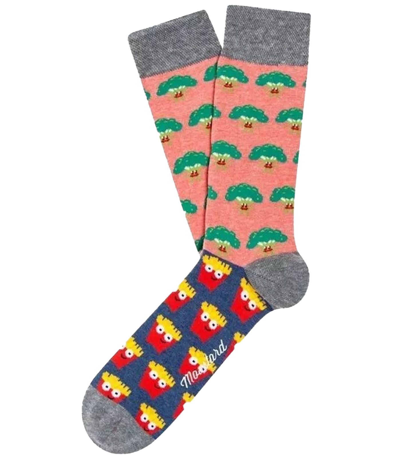 Lot de 3 paires de chaussettes Moustard Brocoli vs Frites en coton imprimé intégral, chaussettes hautes à motifs 18S-BROC Gris/Rose/Jaune
