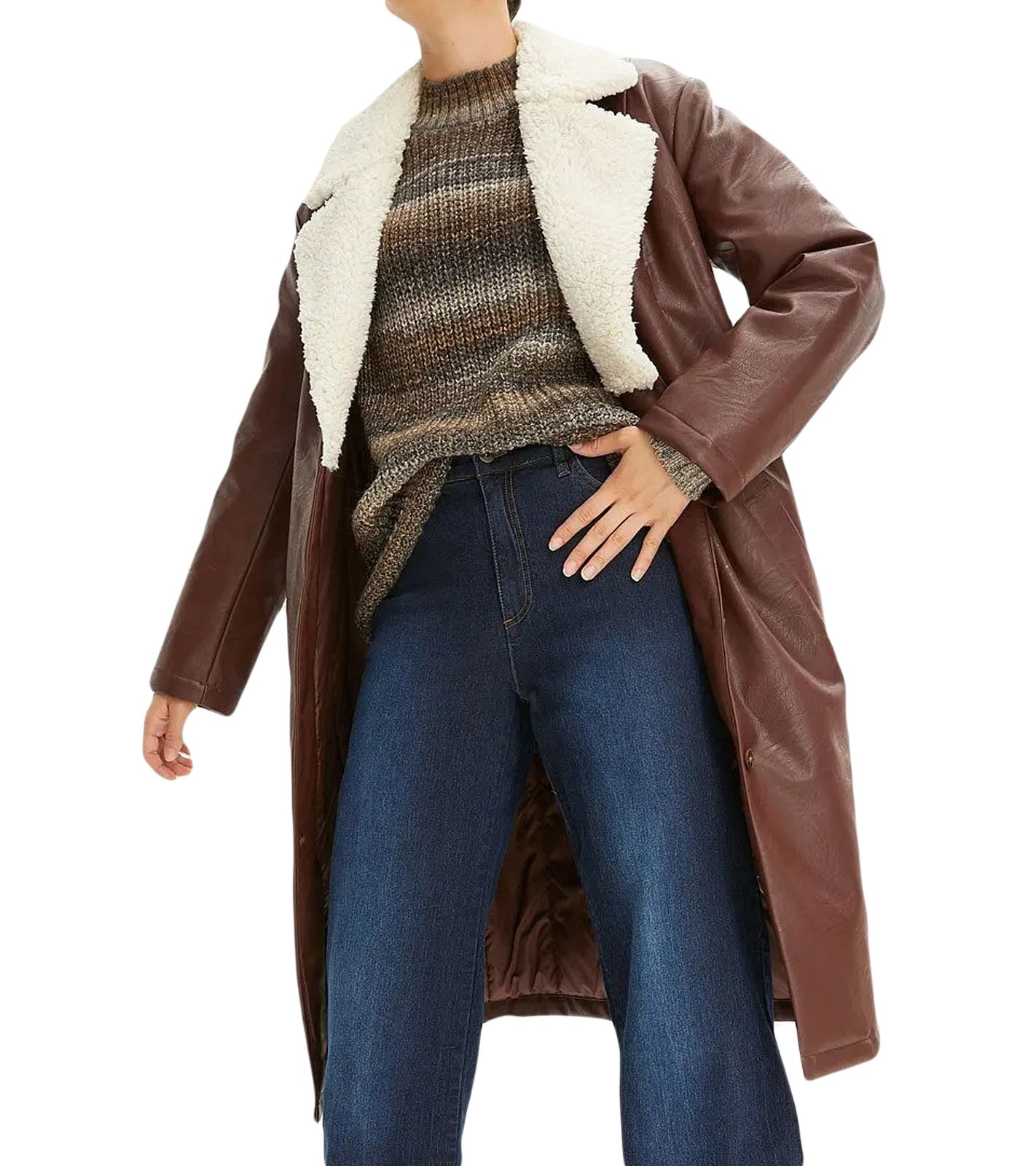 Manteau en similicuir pour femme avec col en fourrure teddy, manteau de tous les jours surdimensionné, veste à manches longues, veste de transition 915415 marron foncé/crème