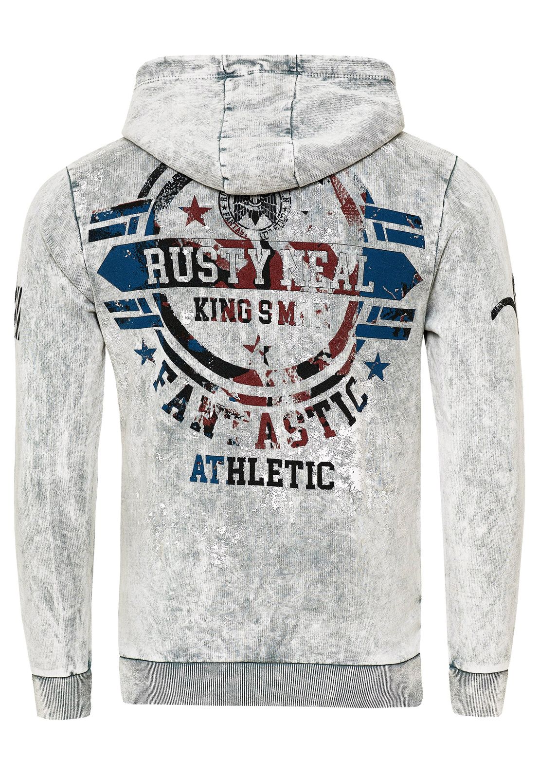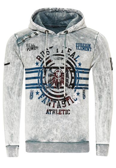 Pull à capuche pour homme, modèle 19130 gris, en toile délavée à l'huile avec imprimés vintage et boutons décoratifs.
