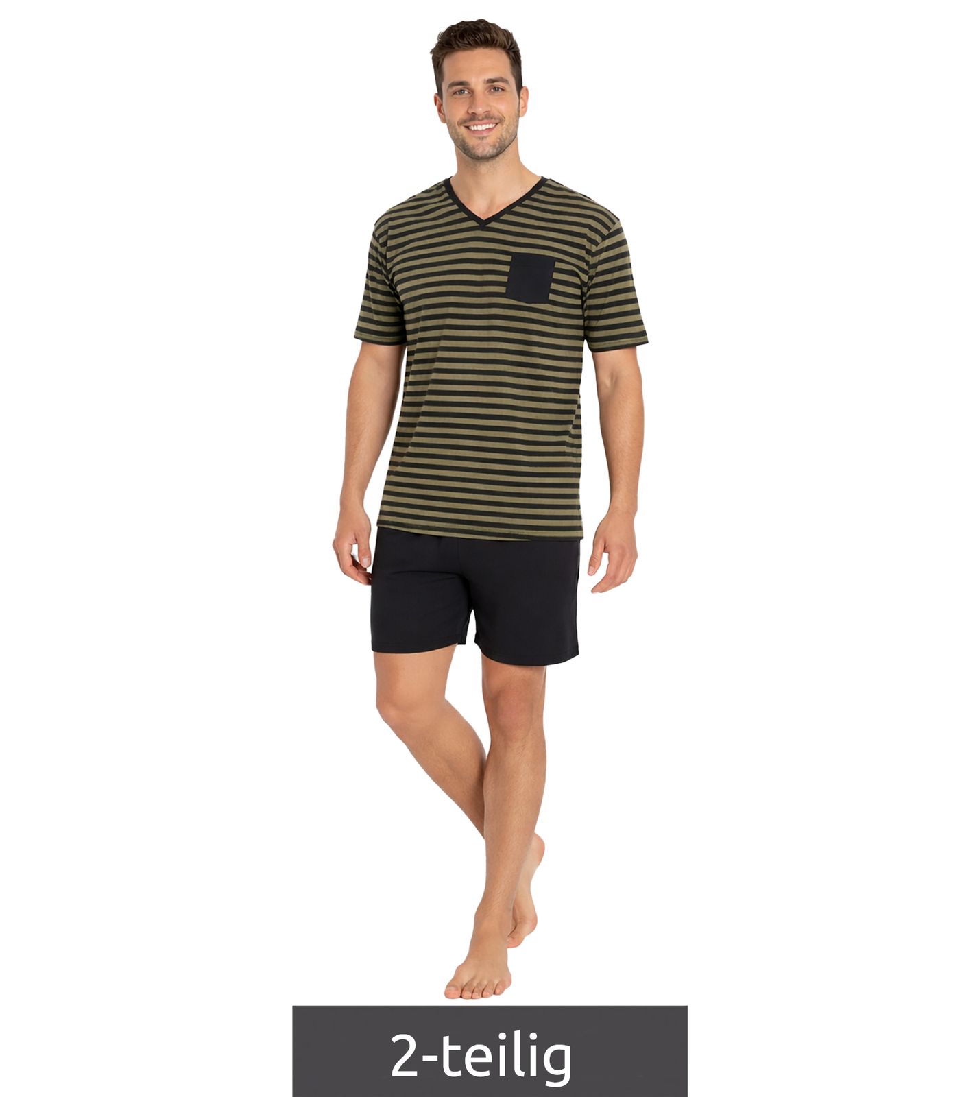 Pyjama court deux pièces pour homme, en coton doux, avec poche poitrine et rayures, coloris noir/olive (réf. 957908).