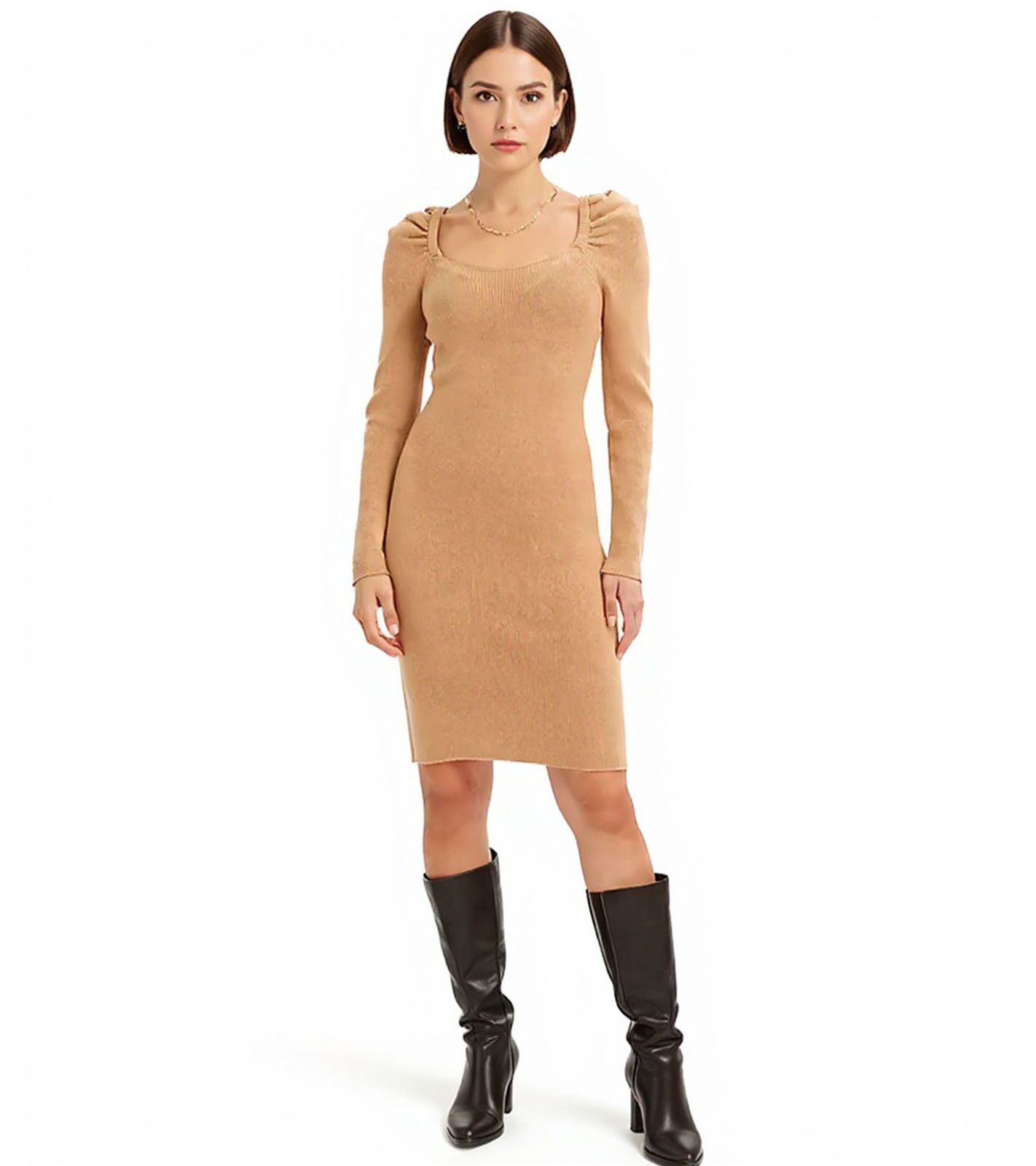 Robe courte en maille côtelée à encolure carrée et manches longues pour femme (921895) Marron