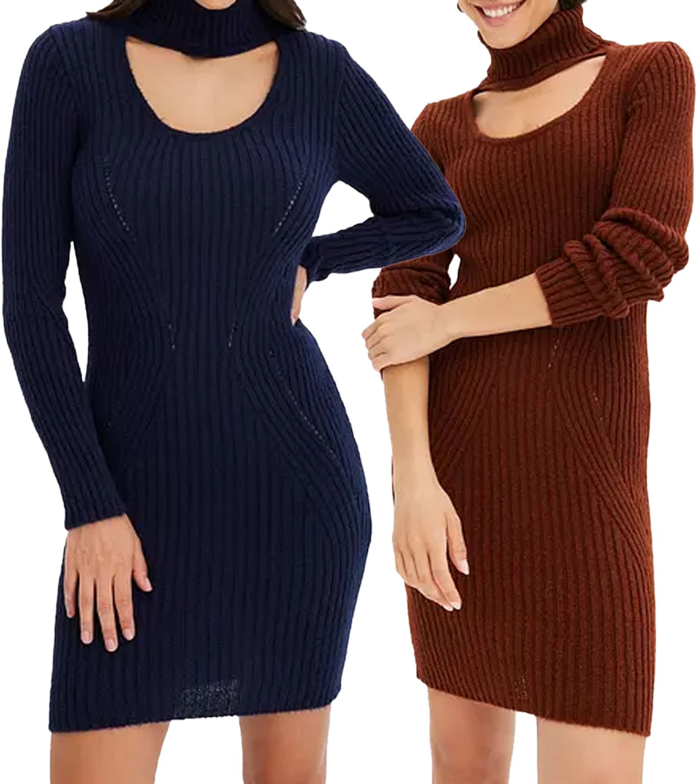 Robe mini en maille pour femme avec col roulé et détails découpés Robe à manches longues en marron acajou ou bleu foncé