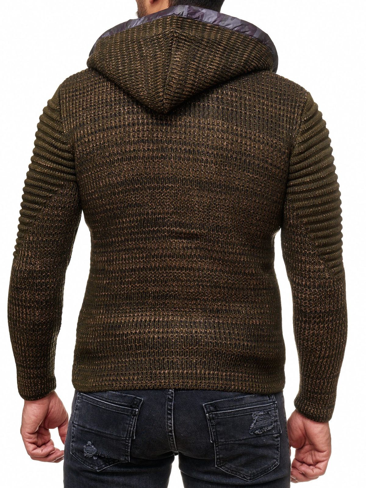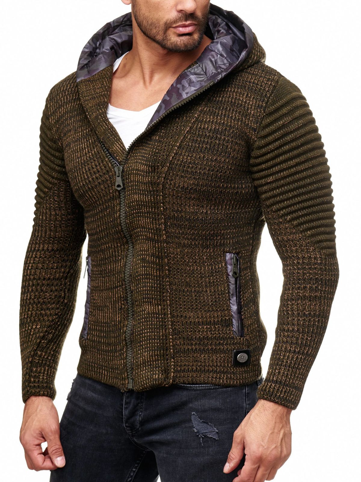Veste en maille moderne pour homme, avec capuche et fermeture éclair asymétrique, style motard, sweat à capuche en maille kaki 13302