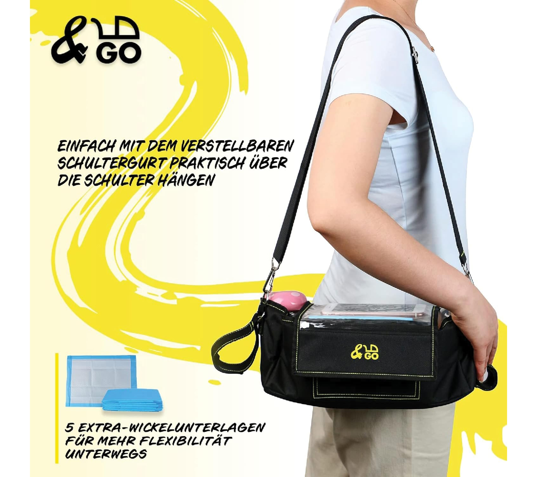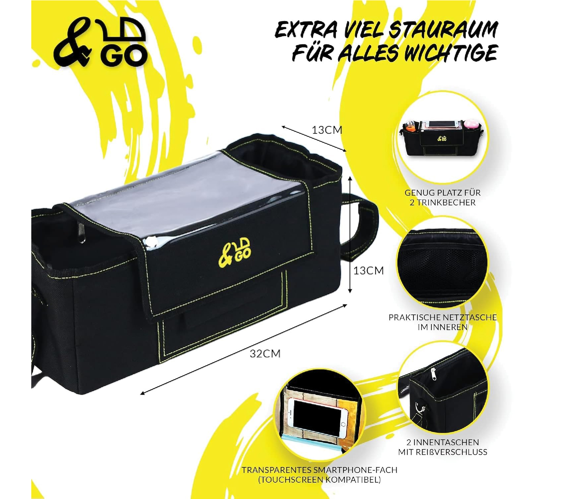 &GO Kinderwagen Organizer inkl. 5 Wickelunterlagen Universal Buggy Tasche mit transparentem Smartphone-Fach Regenschutz Getränkehalter & viel Stauraum Schwarz