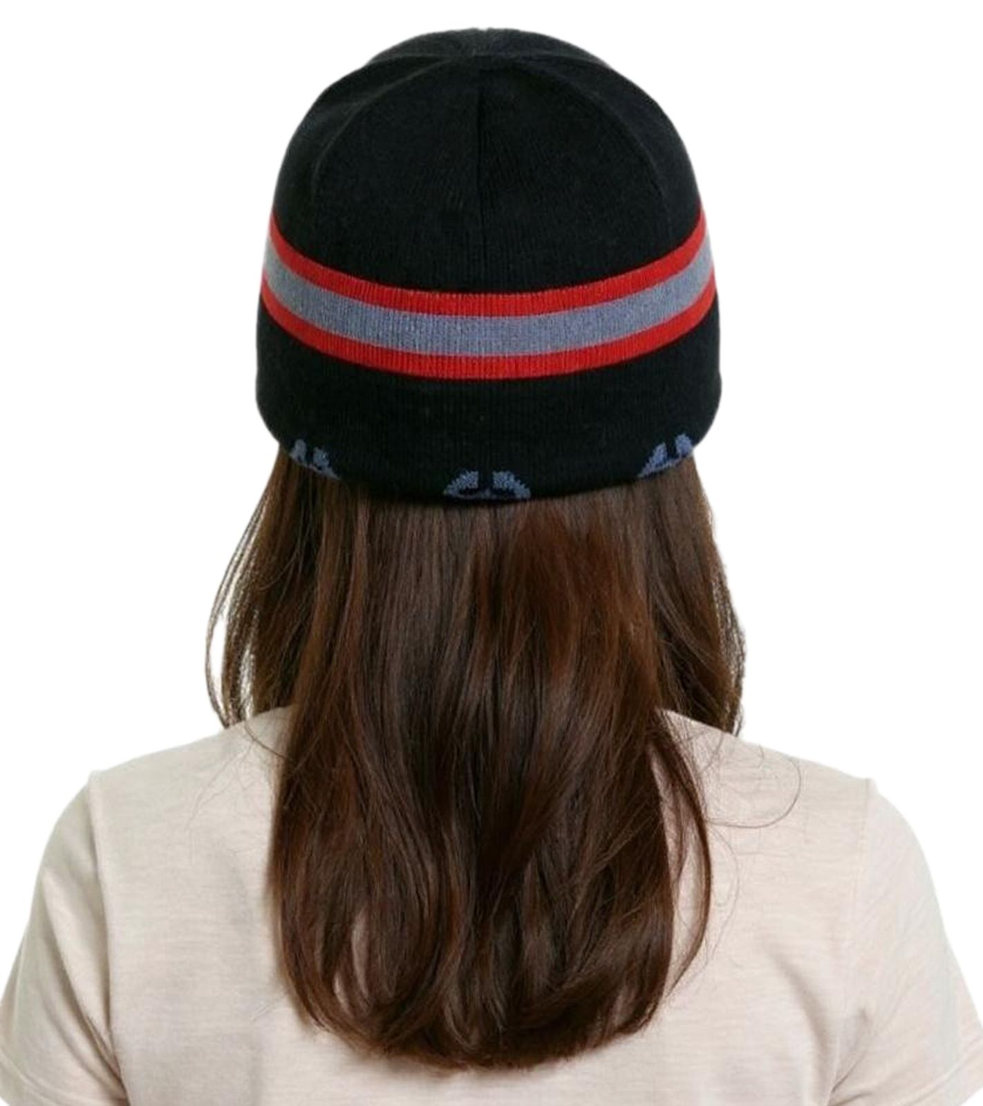 Il berretto è reversibile e presenta una fantasia più vistosa su un lato e un motivo a righe più sobrio sull'altro.