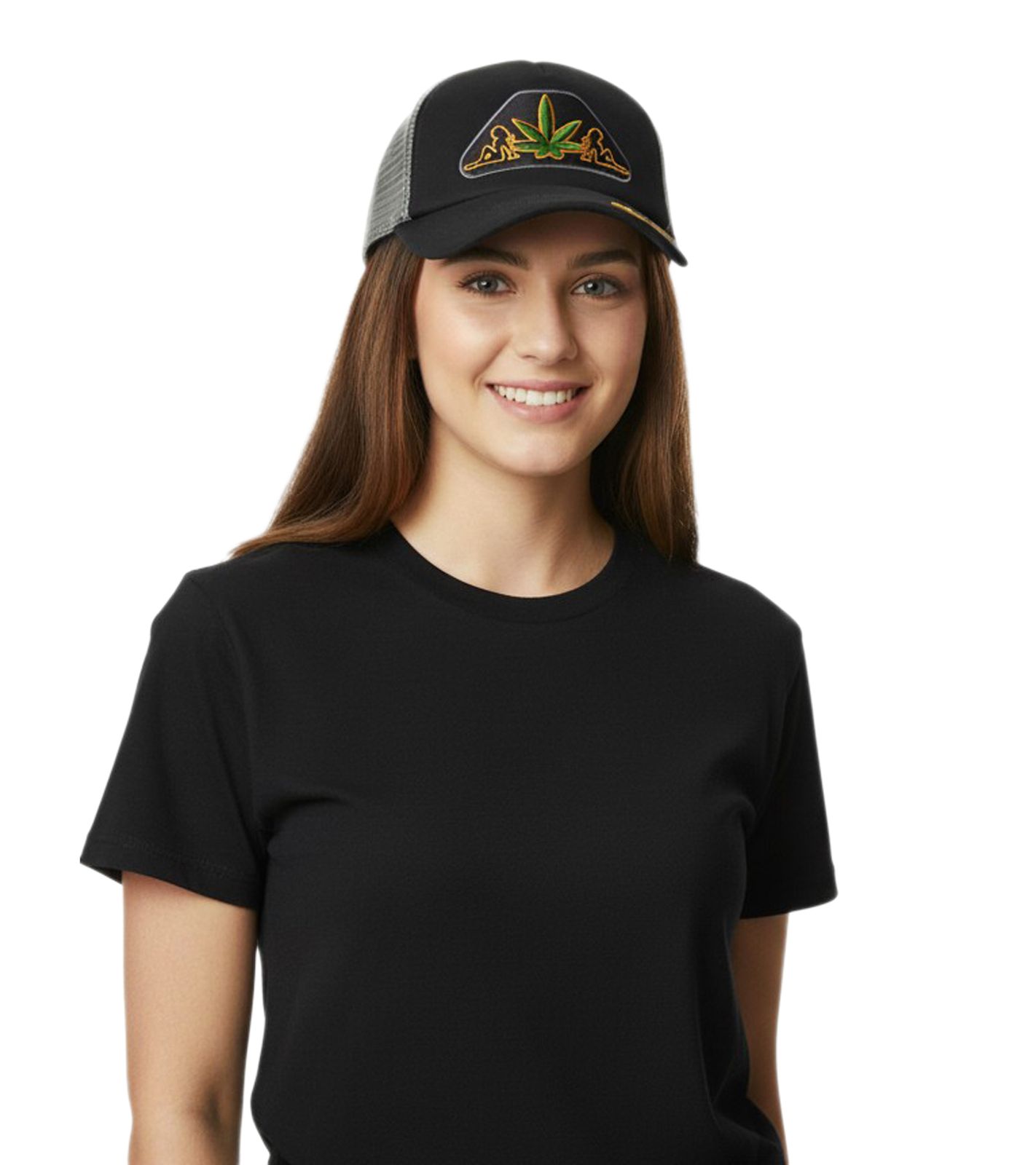 Ricamo con donna e foglia di canapa sul davanti