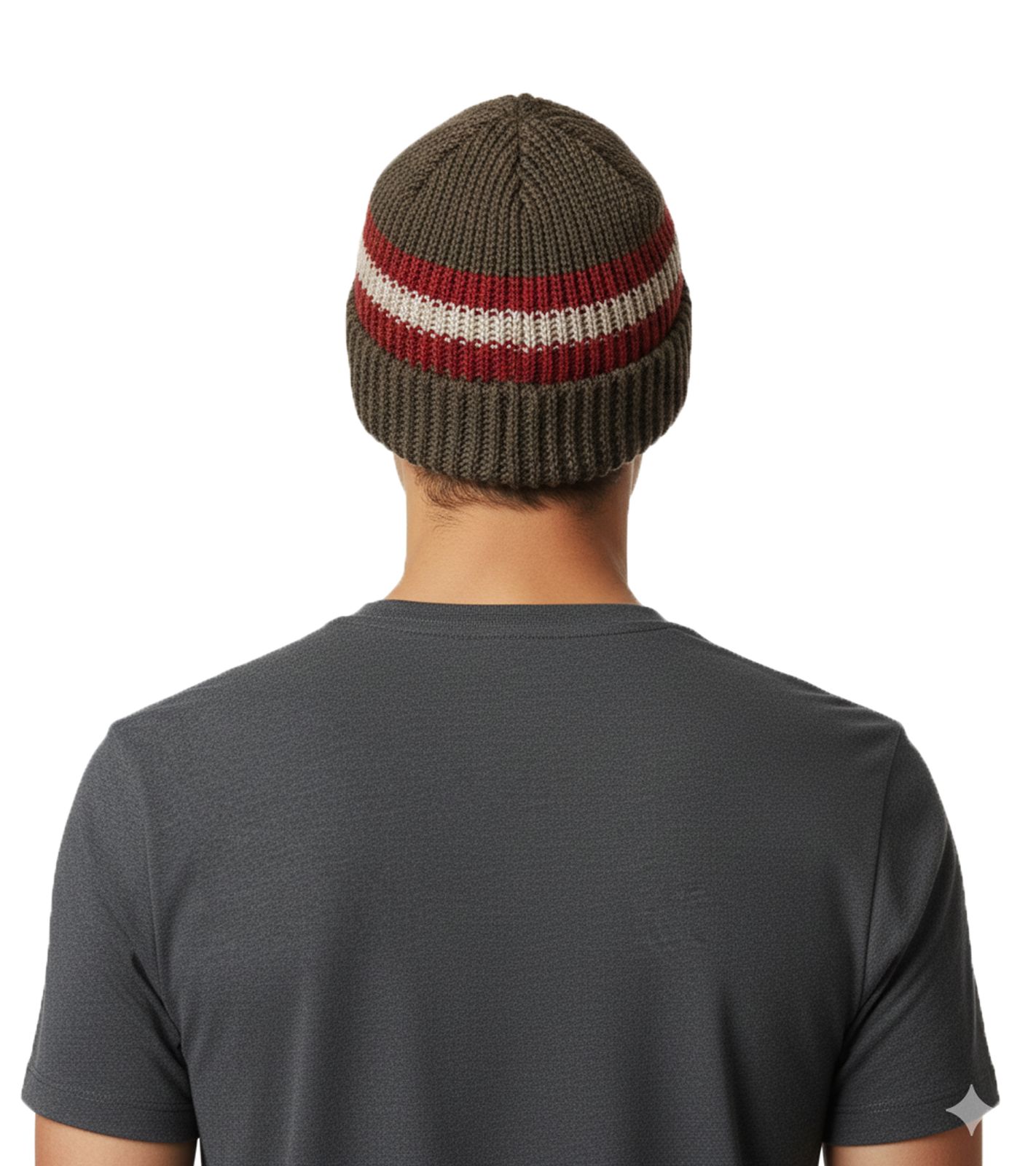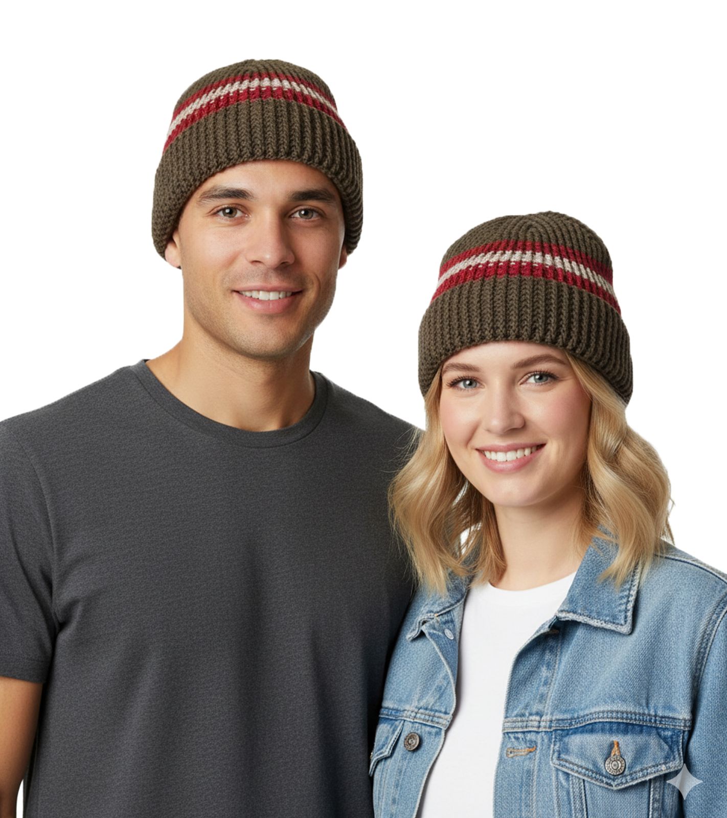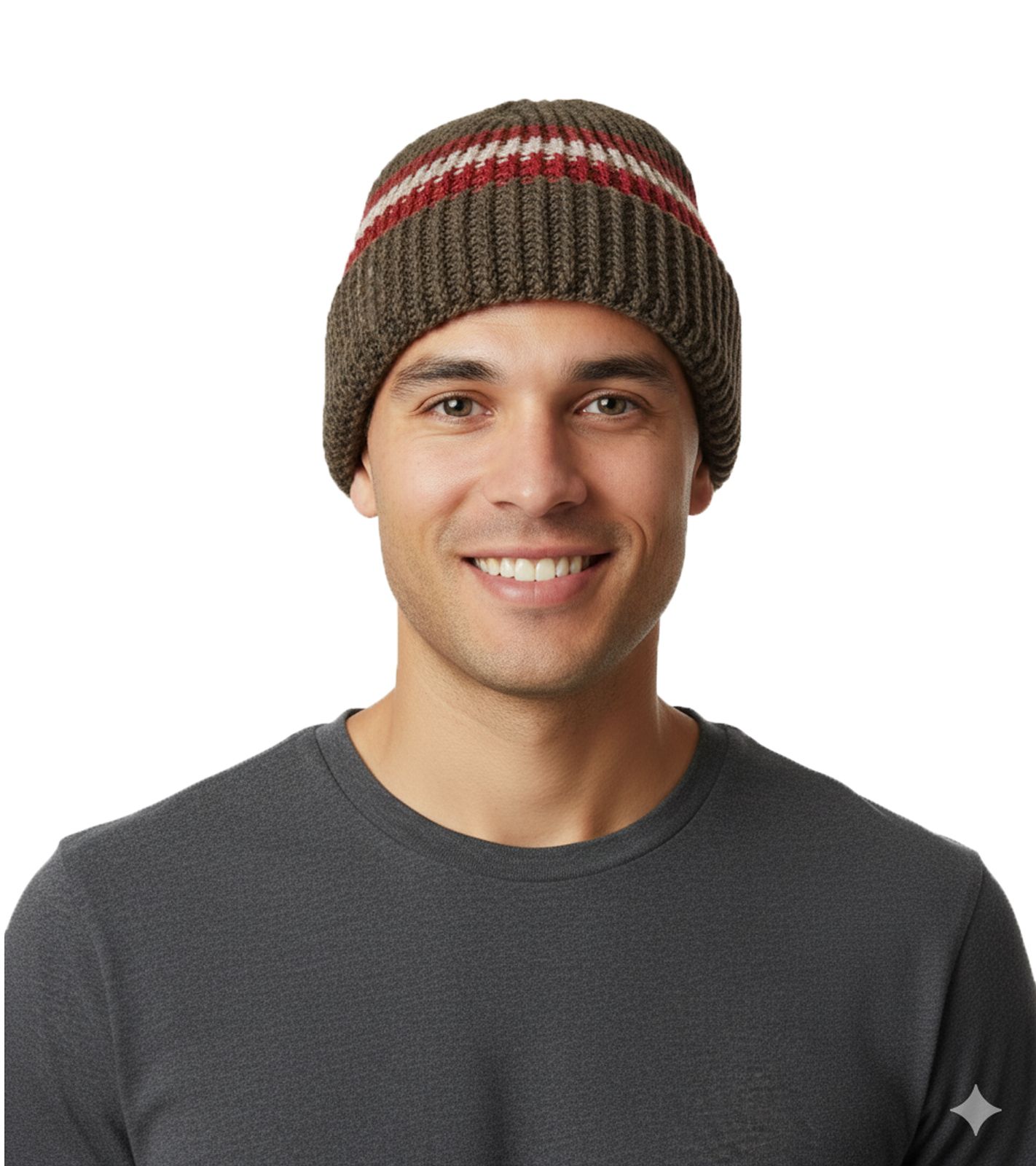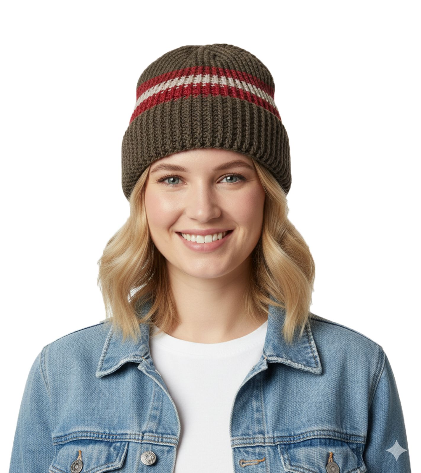 Elegante berretto invernale all'uncinetto, morbido berretto lavorato a maglia a righe, berretto in cotone 7313GUY verde oliva/rosso/bianco