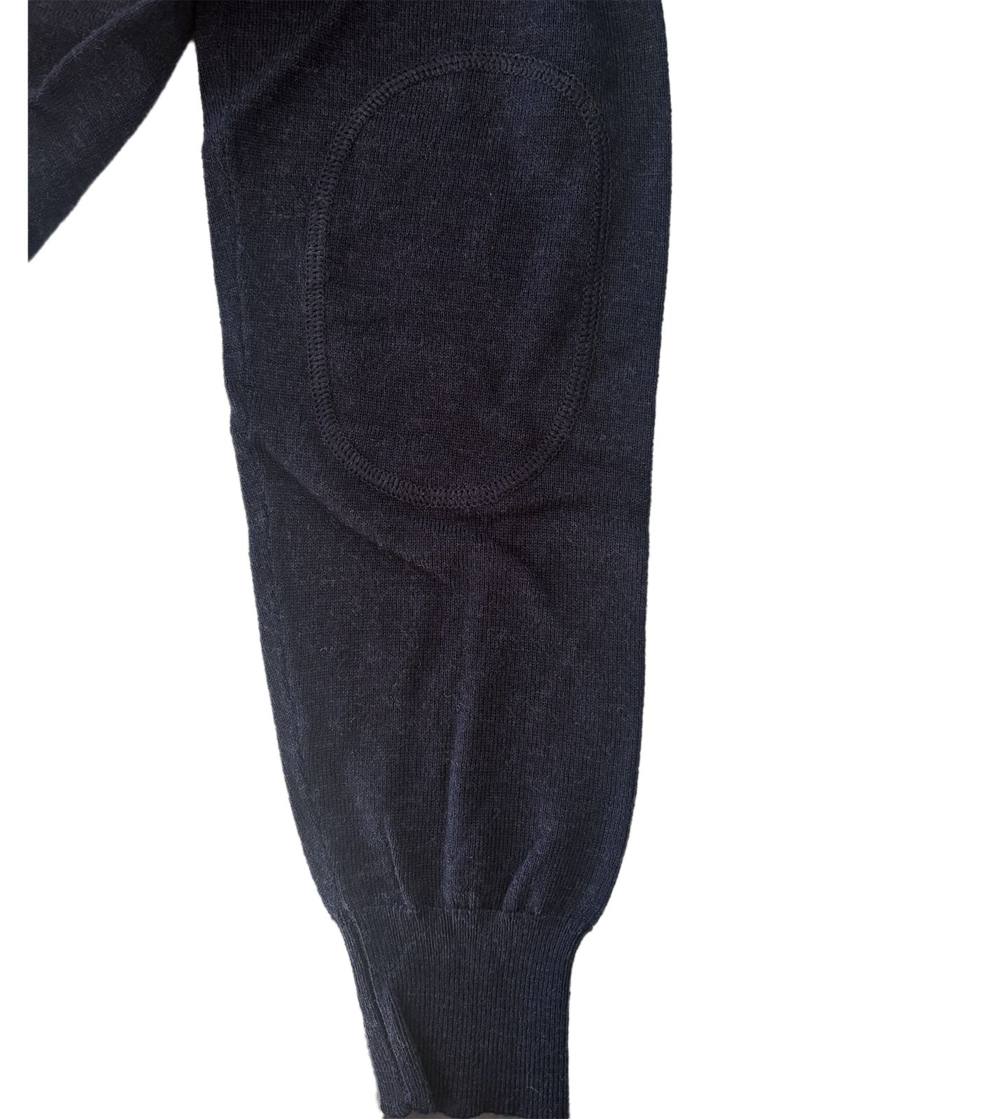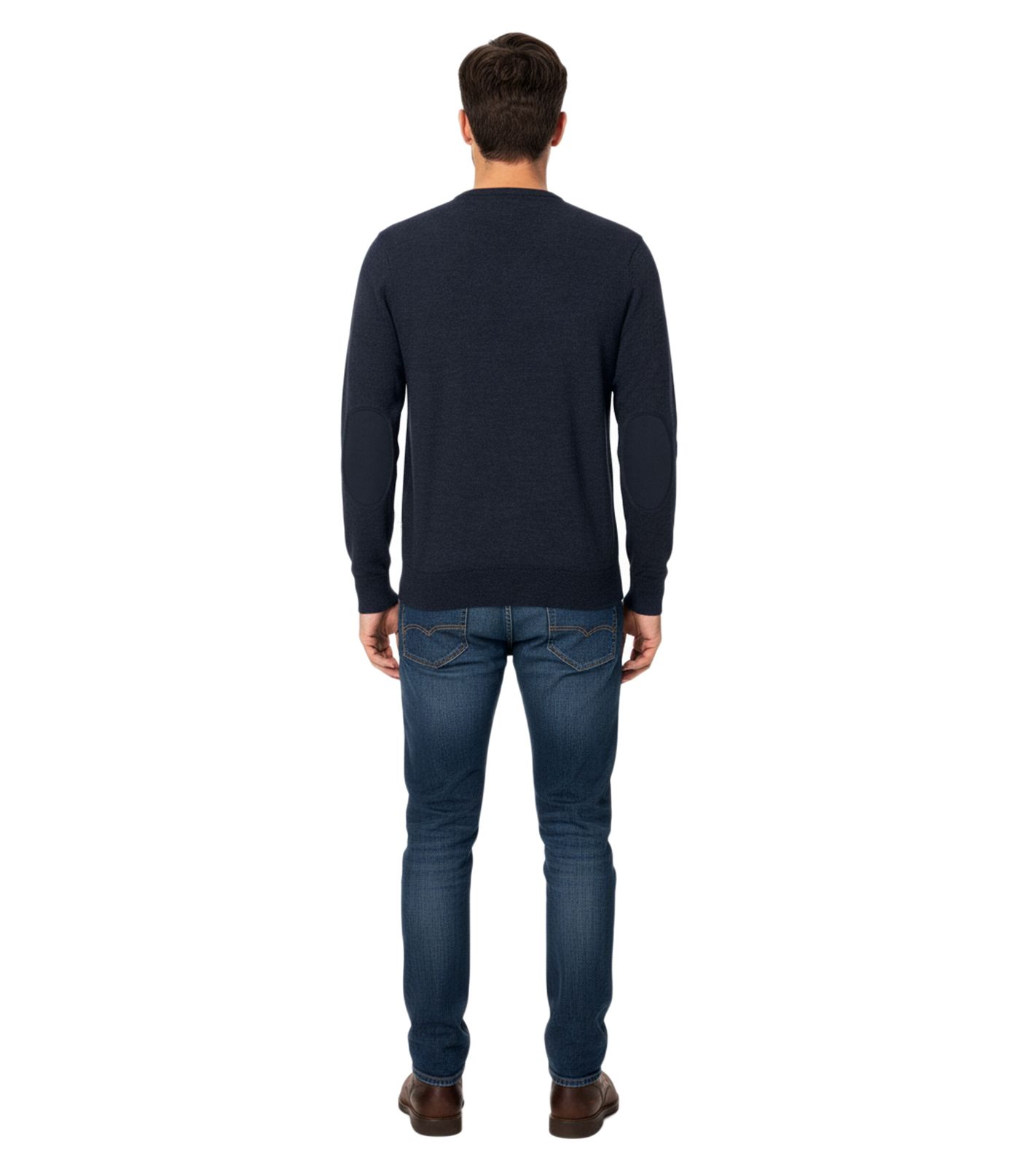 Maglione da uomo alla moda in maglia con toppe sui gomiti tono su tono, lana merino, 144-034, blu scuro