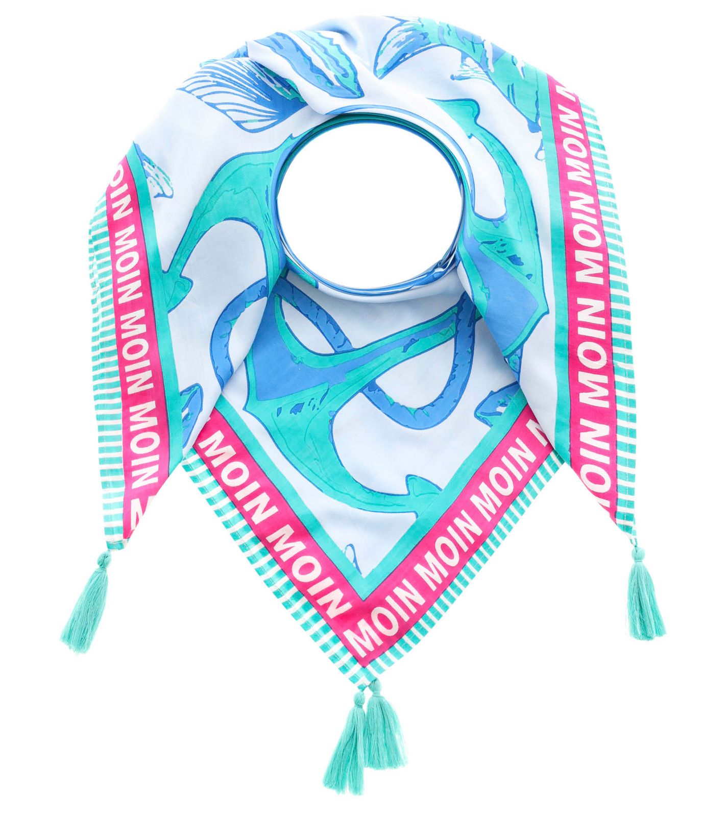 Sciarpa quadrata ZWILLINGSHERZ Ocean con ancore e scritta Moin Moin, sciarpa alla moda 3016Q-0208-69 Blu/Rosa/Menta