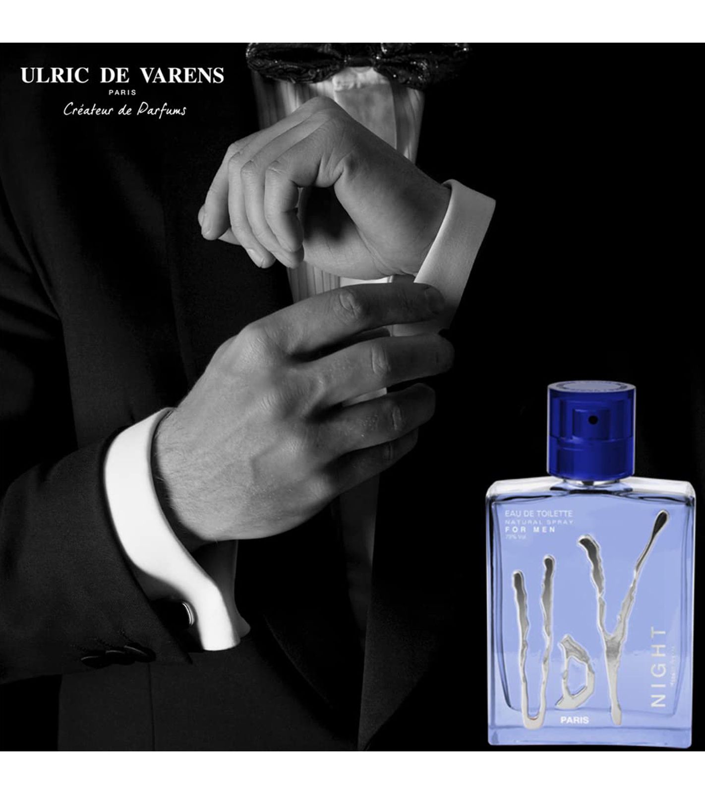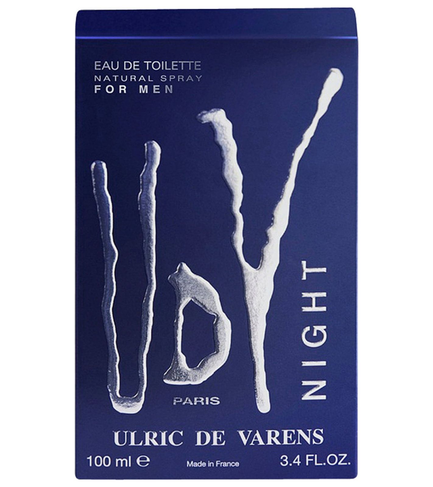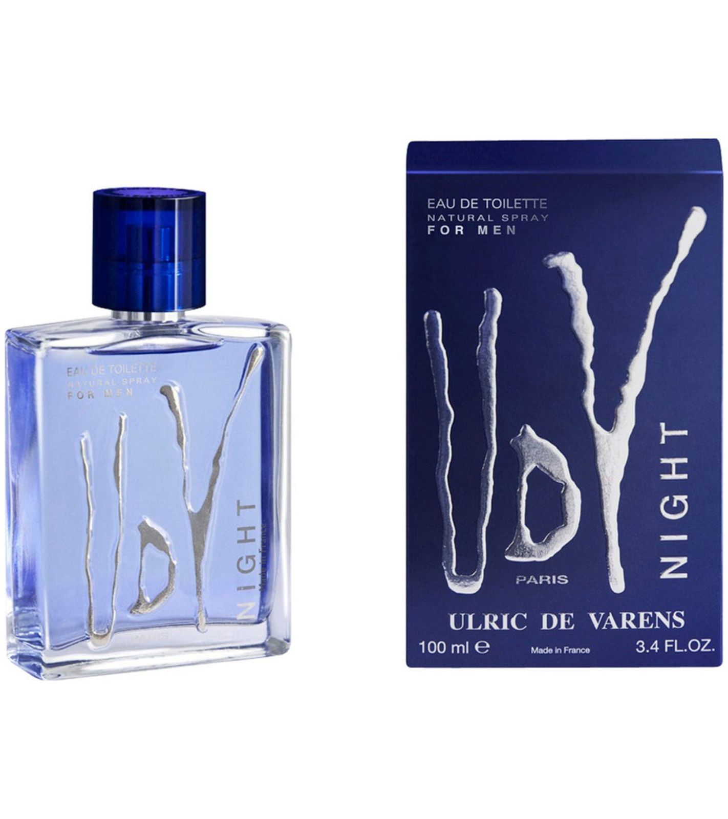 Seducente Eau de Toilette da uomo Ulric De Varens Night Paris, fragranza corpo fruttata e orientale, 100 ml, blu