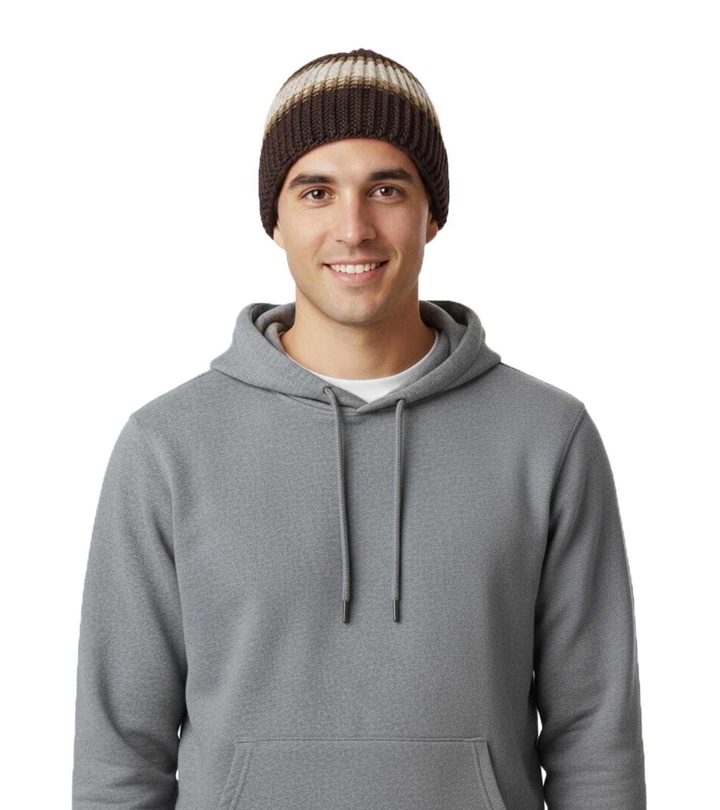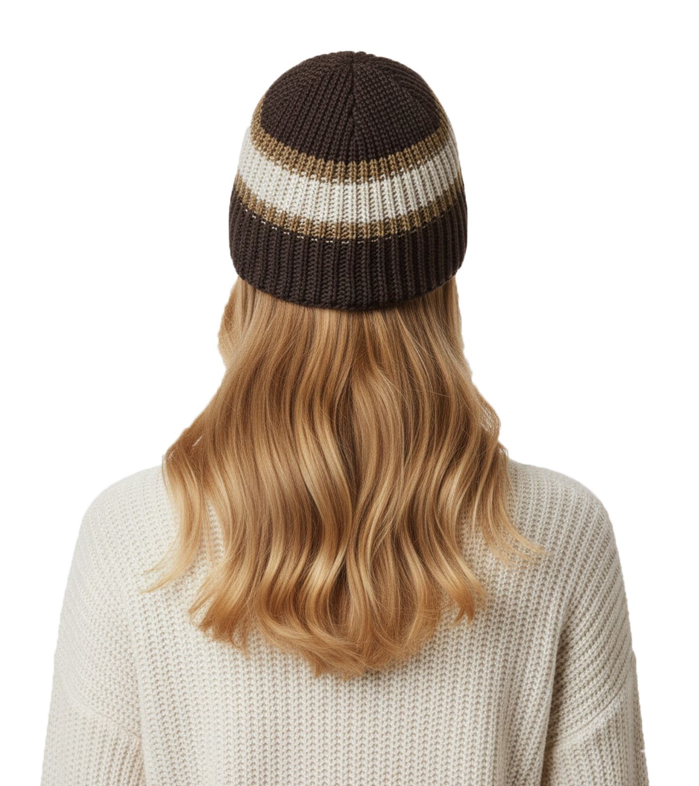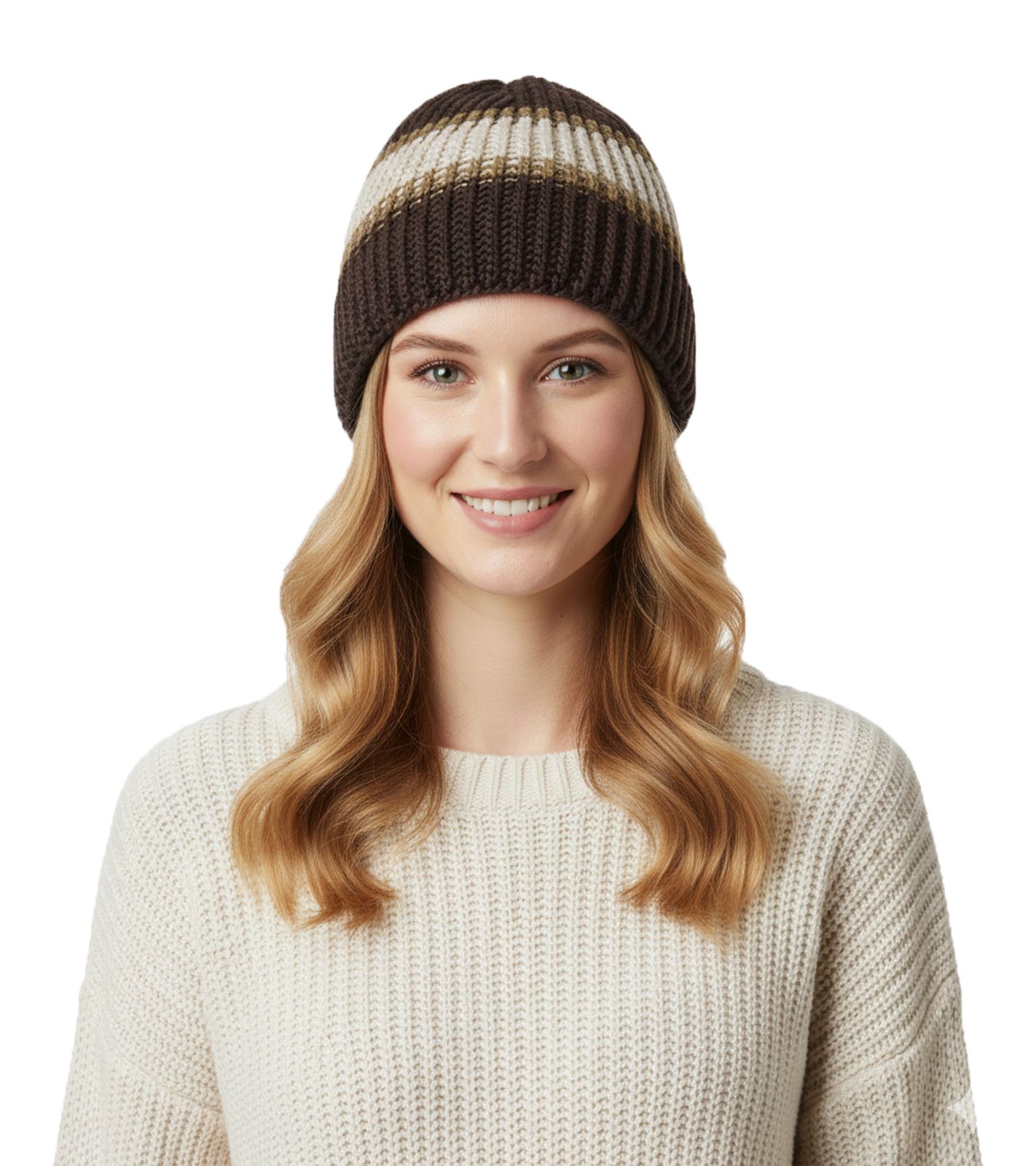 kuschelige Häkel-Mütze Winter-Mütze weiche Strick-Mütze mit Streifen 7315GUY Braun/Weiß/Grün