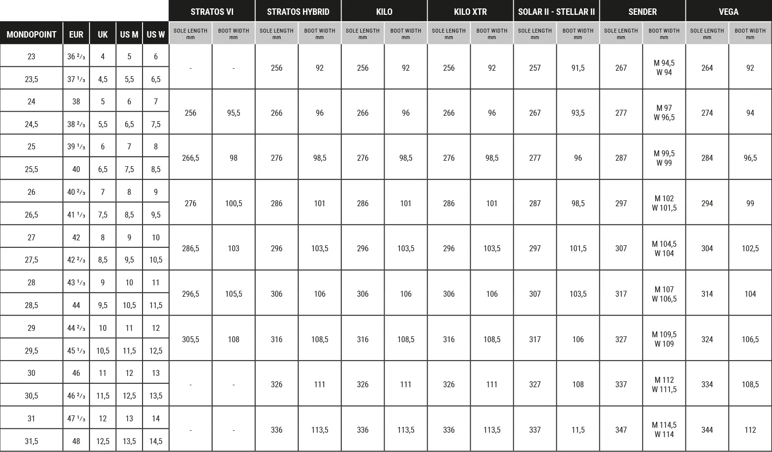 - Hinweis: Die zu bestellende Größe sind Mondopoint-Größen!