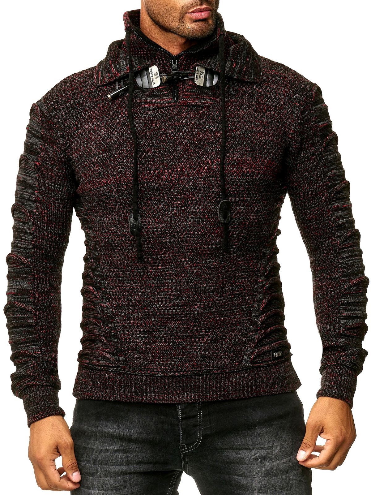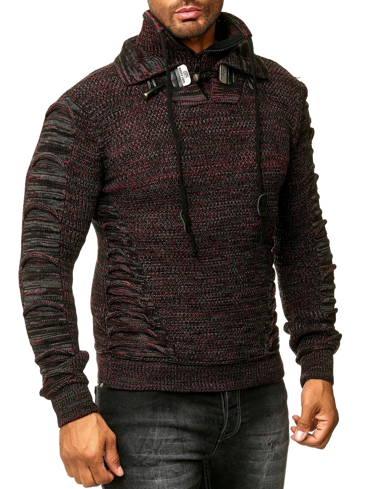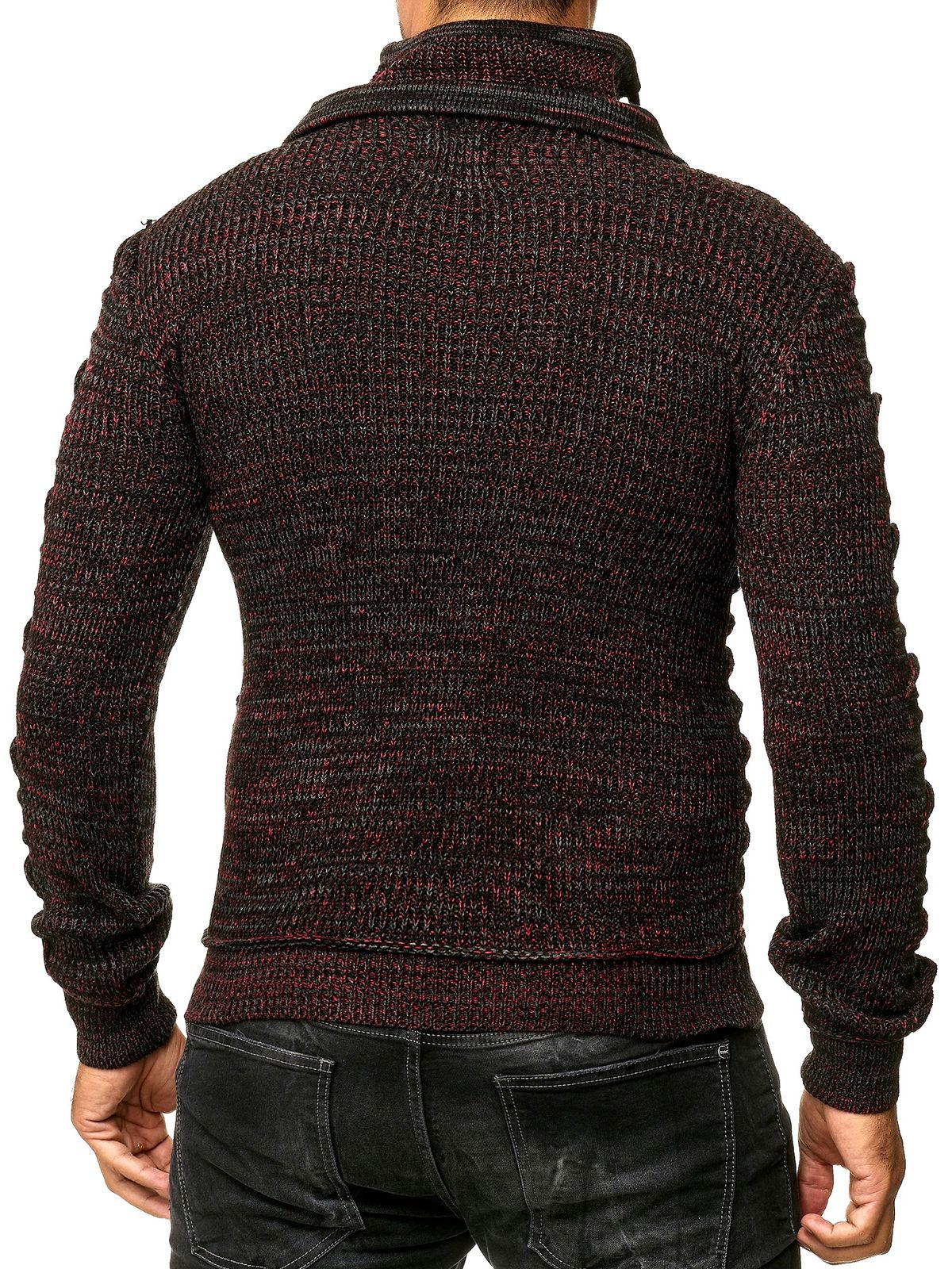 Markanter Herren Grobstrick-Pullover mit Stehkragen und Kragenverschluss Strick-Sweater mit Struktur und Raff-Optik 13320 Rot