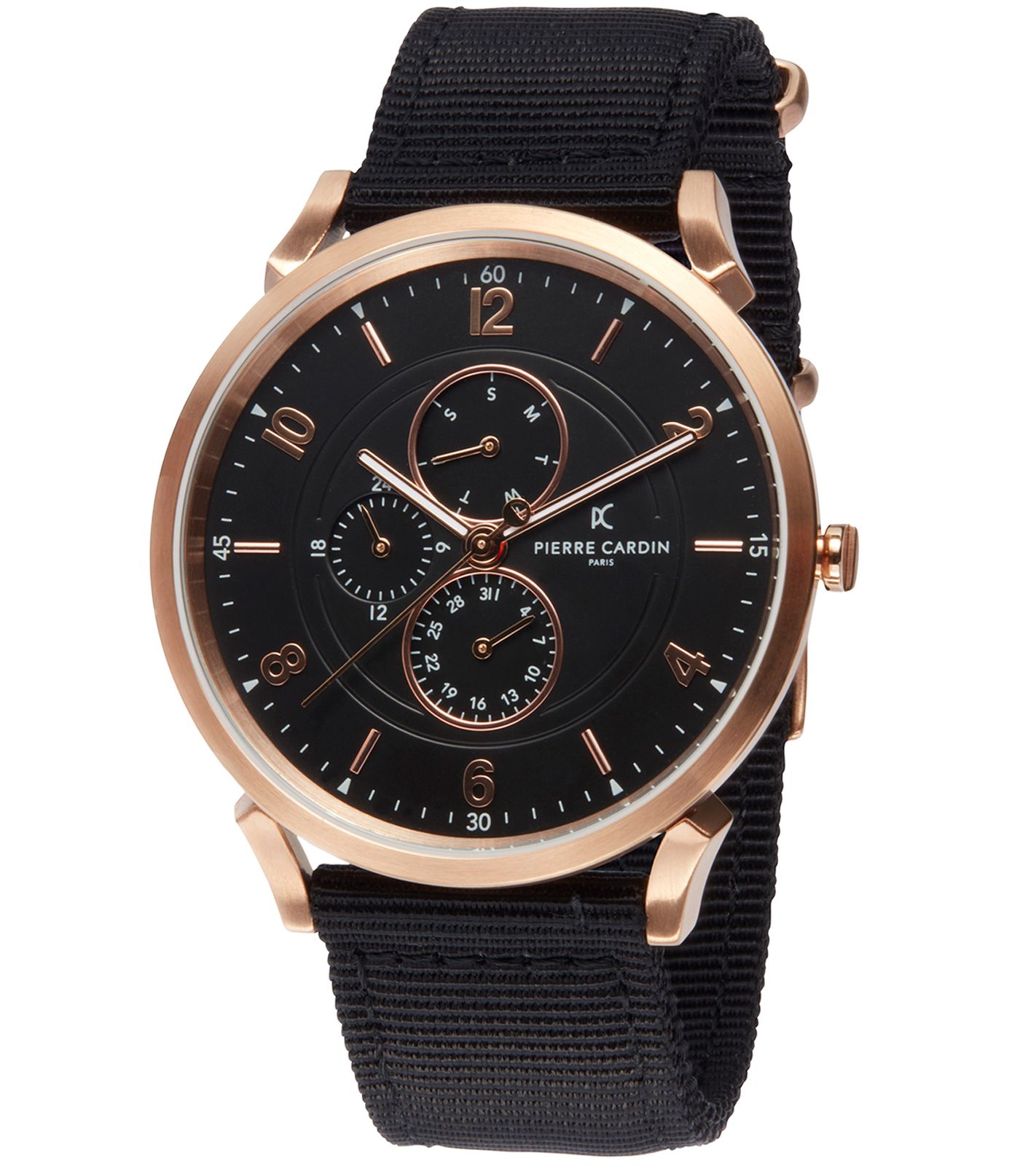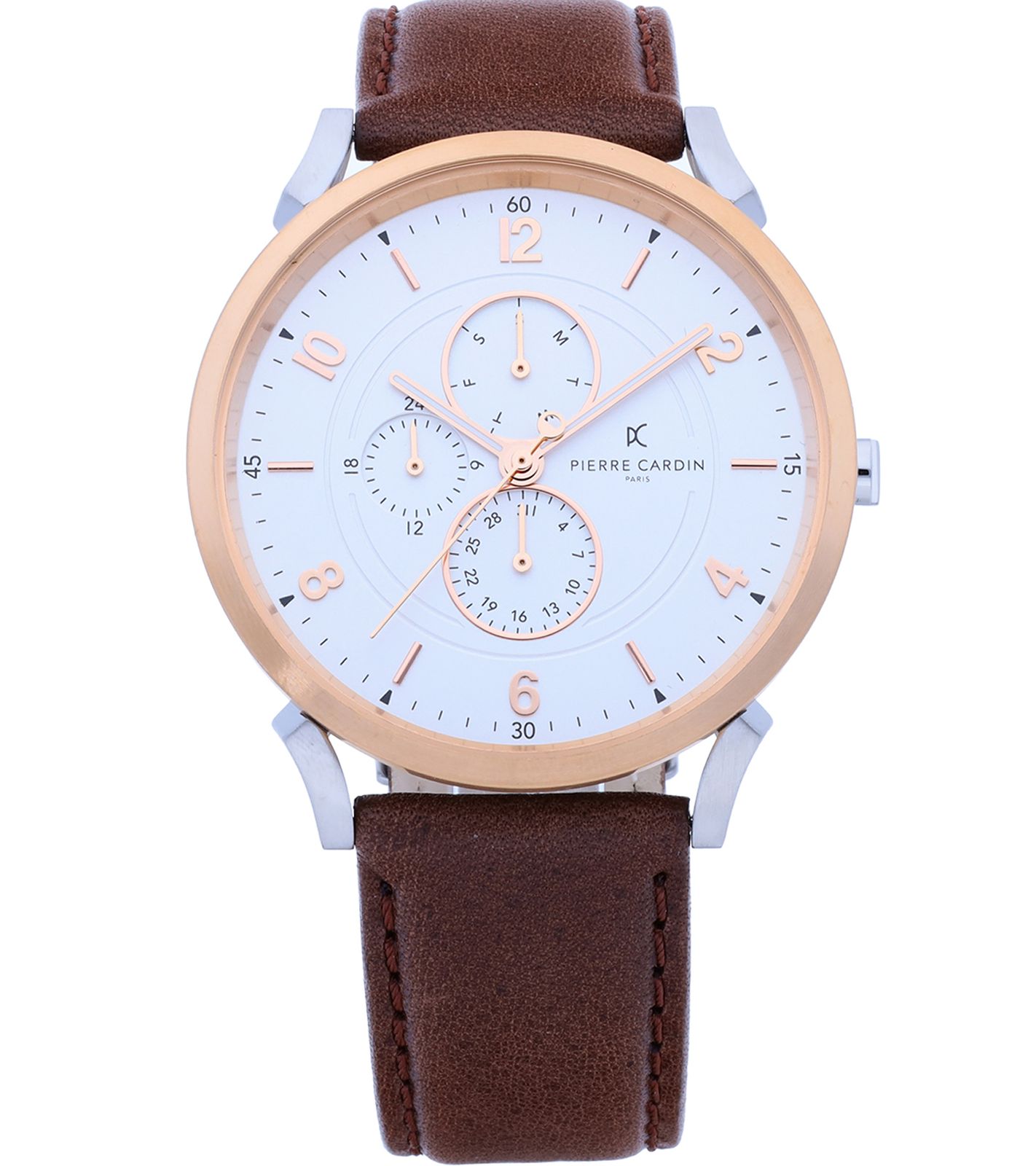 Pierre Cardin Herren Armband-Uhr mit Multi-Ziffernblatt analoge Quarz-Uhr 3ATM 44mm mit Leder-Armband in Braun/Rosegold/Silber oder mit Textil-Armband in Schwarz/Kupfer