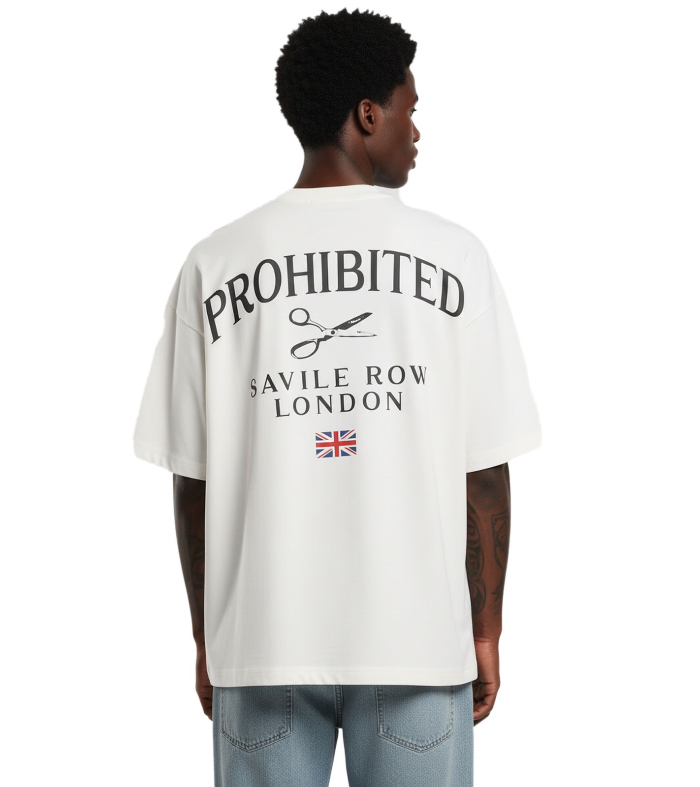 Prohibited Savile Row Team Herren T-Shirt Baumwoll-Shirt mit auffälligem Rückenprint Kurzarm-Shirt Oversized-Fit PC-006-041 Weiß