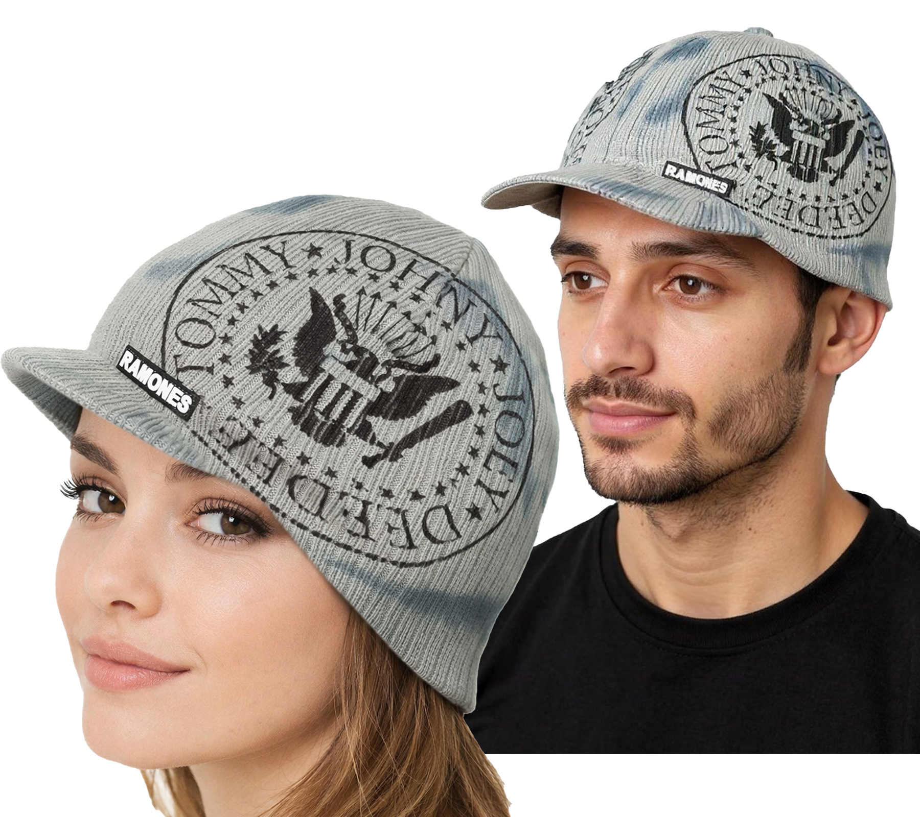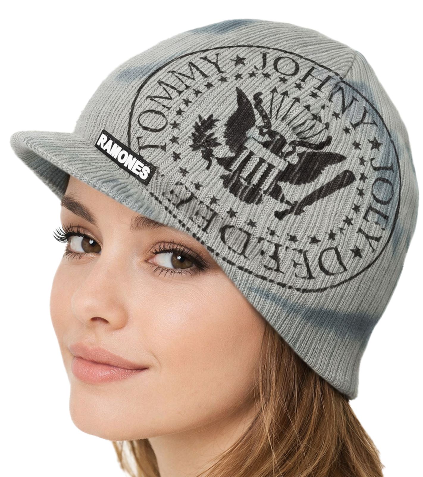 RAMONES Rockband Schirm-Beanie mit Band-Print Strick-Mütze mit Patch Fan-Beanie KC100814RAM Grau