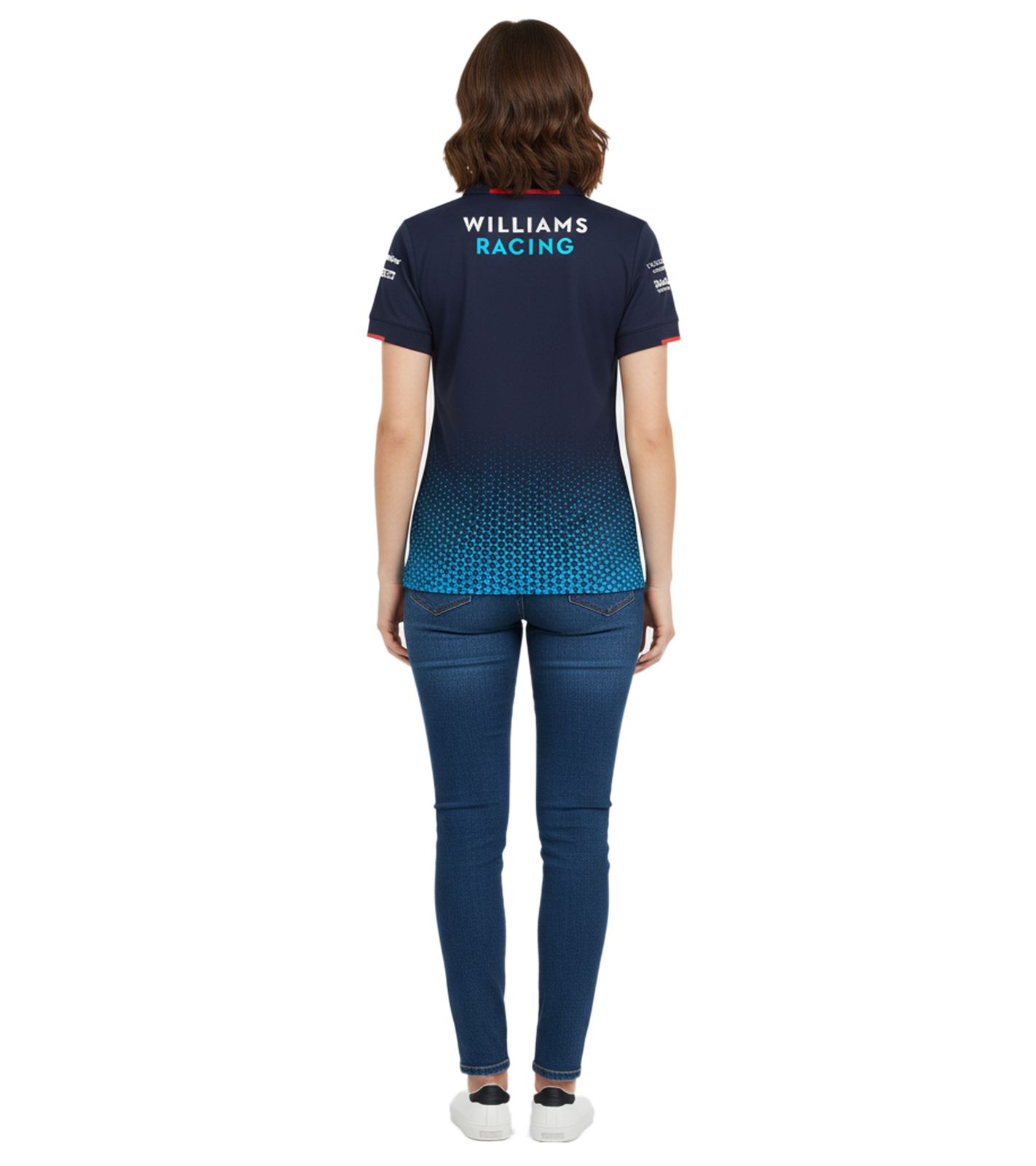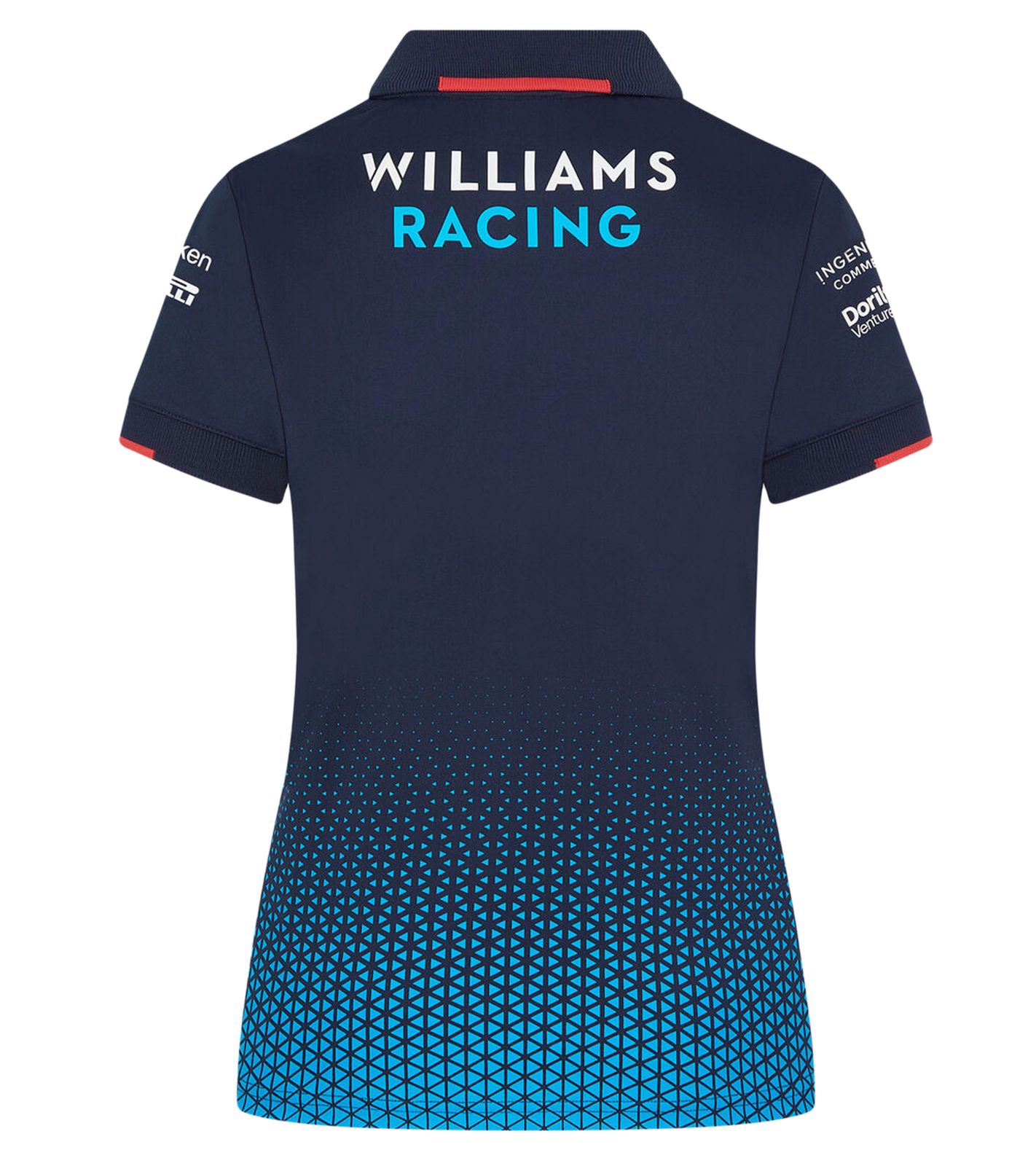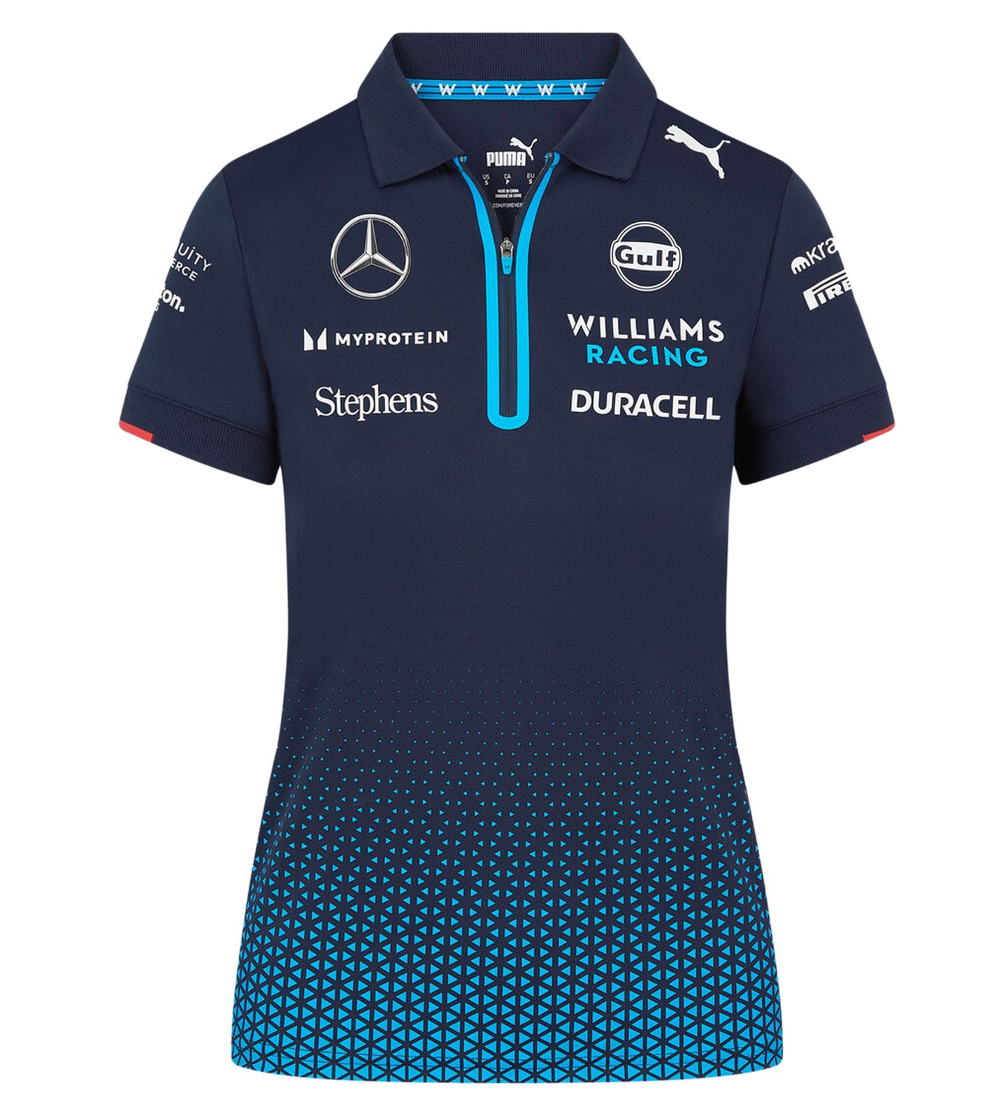 - Das offizielle Williams Racing Team 2024 Poloshirt für Damen mit Reißverschluss-Kragen. Das Damen-Polo weist den gleichen Farbverlaufsdruck auf, der in der gesamten Team-Kollektion 2024 zu sehen ist, sowie alle offiziellen Team- und Sponsoren-Brandings der Formel-1-Saison 2024