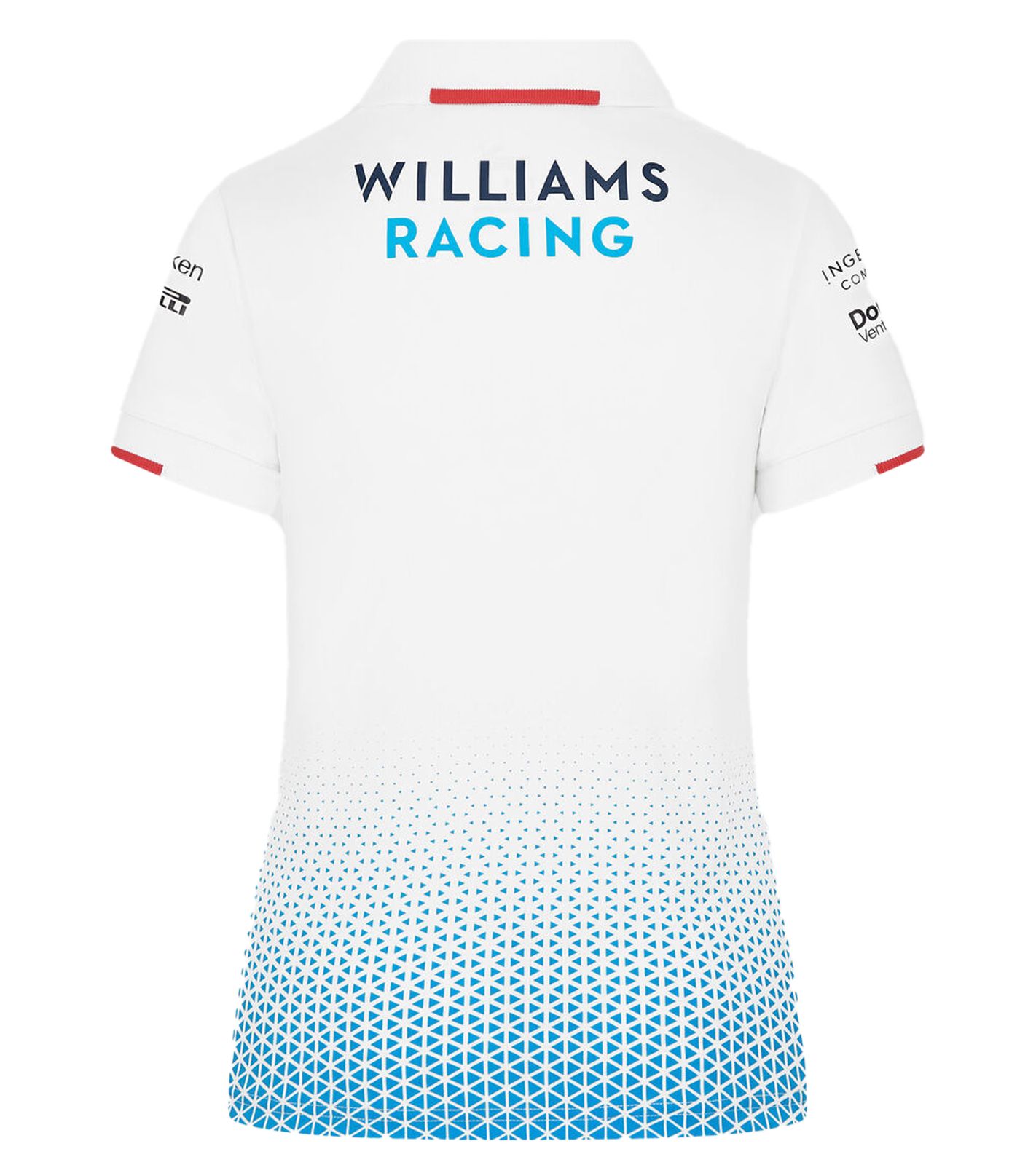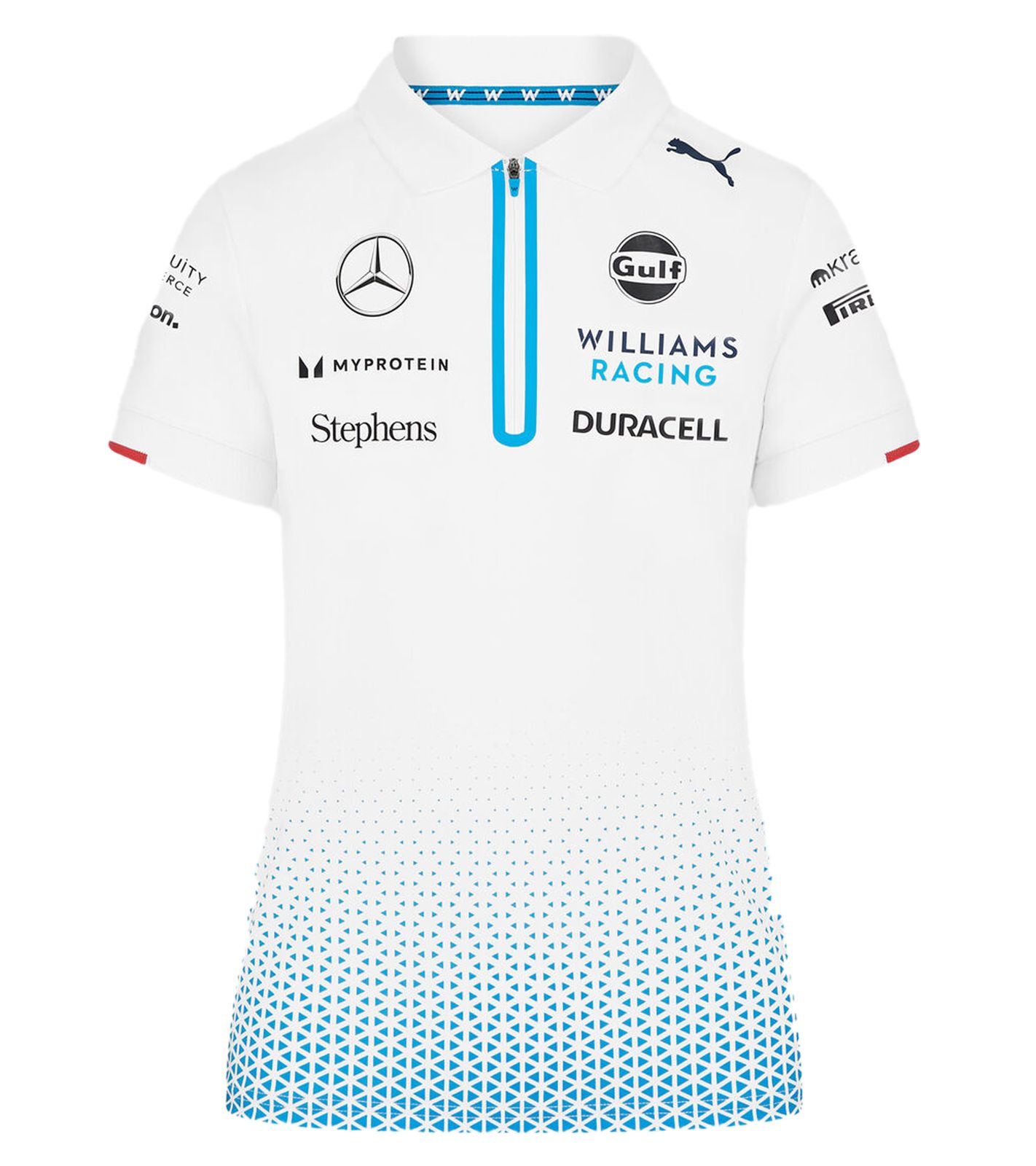 - Das offizielle Williams Racing Team 2024 Poloshirt für Damen mit Reißverschluss-Kragen. Das Damen-Polo weist den gleichen Farbverlaufsdruck auf, der in der gesamten Team-Kollektion 2024 zu sehen ist, sowie alle offiziellen Team- und Sponsoren-Brandings der Formel-1-Saison 2024