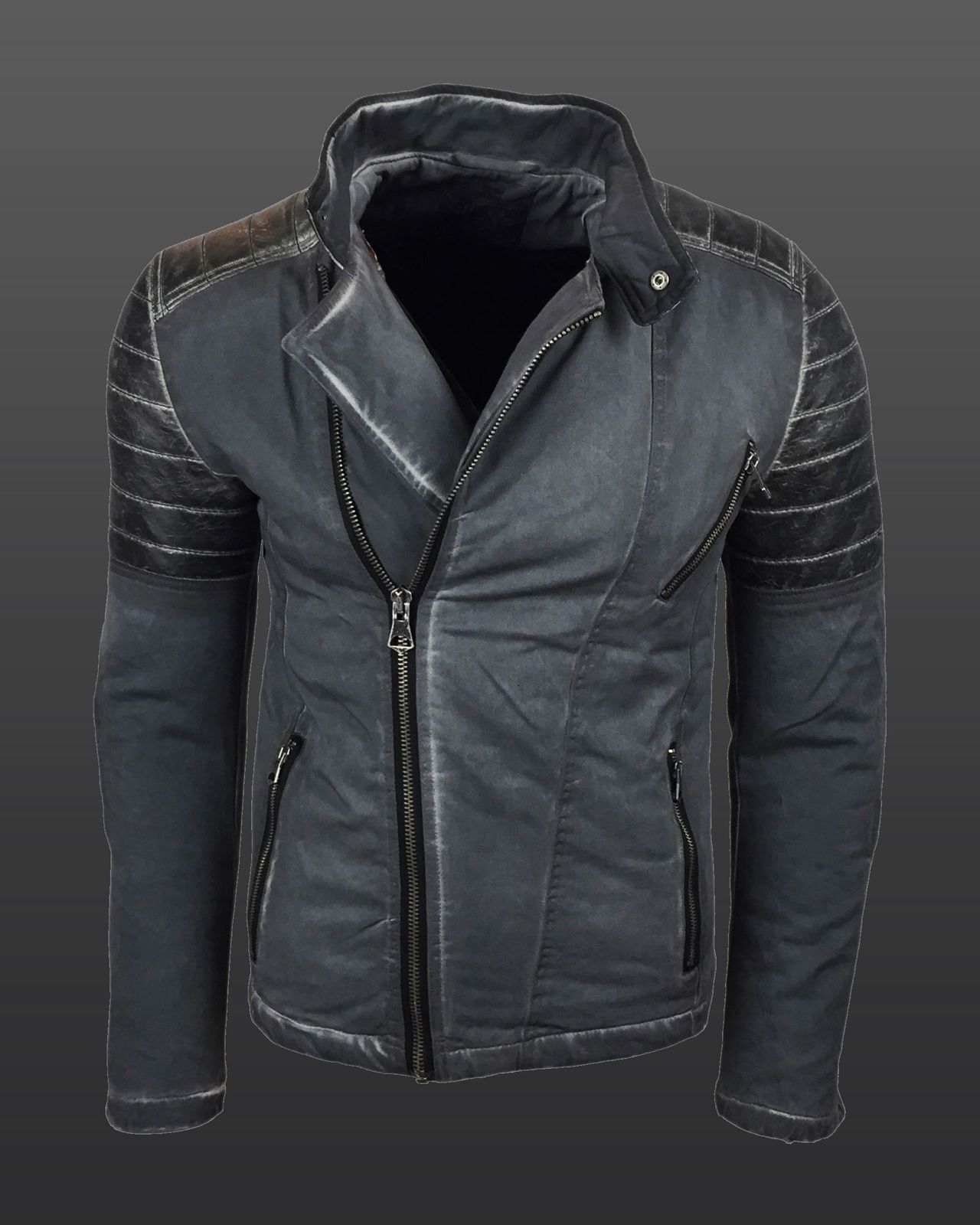 Trendige Herren Biker-Jacke Washed Look mit Kunstleder Ärmeln Slim Fit Übergangs-Jacke 8840 Anthrazit