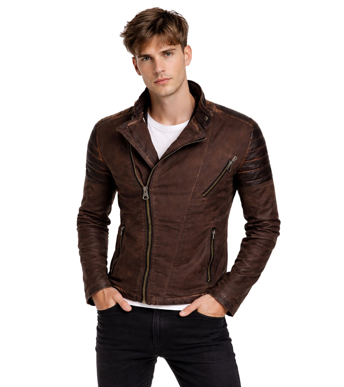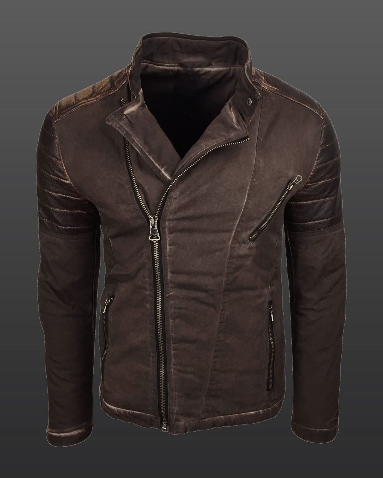 Trendige Herren Biker-Jacke Washed Look mit Kunstleder Ärmeln Slim Fit Übergangs-Jacke 8840 Braun