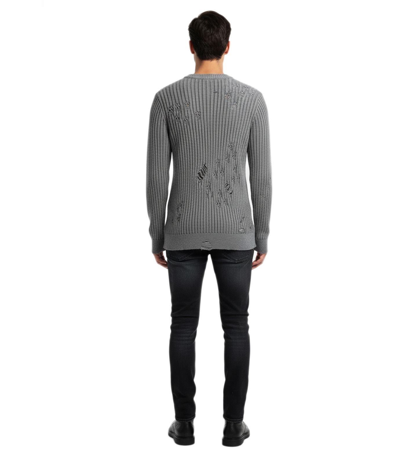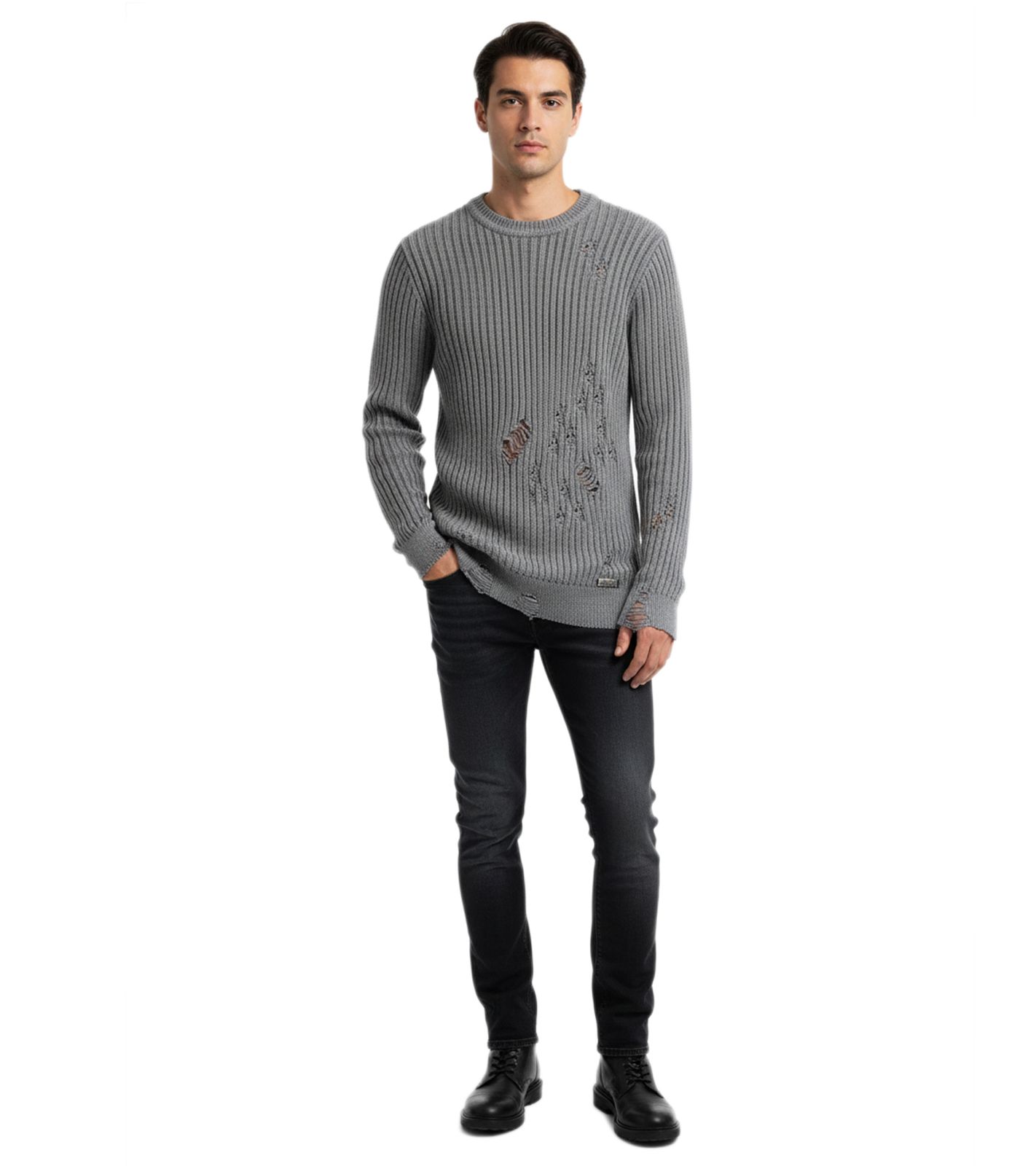 Urbaner Biker-Strickpullover für Herren mit Rundhalsausschnitt Sweater im modernen Used-Look mit Destroyed-Details 13293 Grau