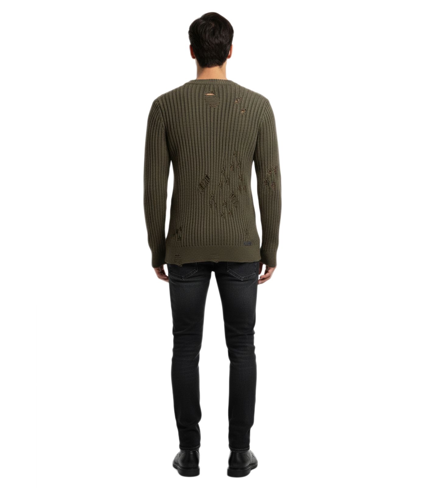 Urbaner Biker-Strickpullover für Herren mit Rundhalsausschnitt Sweater im modernen Used-Look mit Destroyed-Details 13293 Khaki