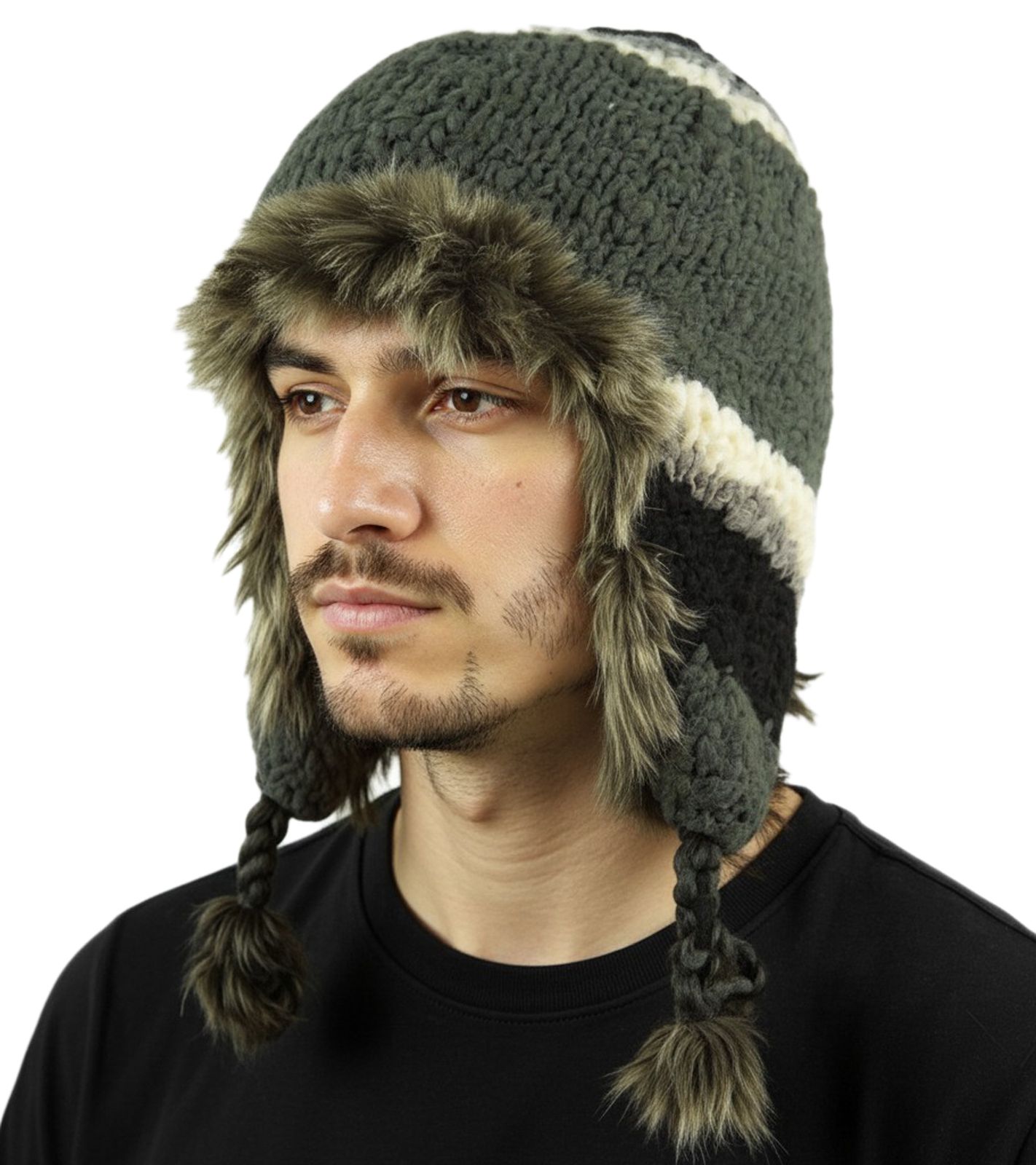 warme Mütze Damen und Herren Kopfbedeckung mit Kunstfell und Fleecefutter BR150259PLB Schwarz/Grün/Grau/Weiß