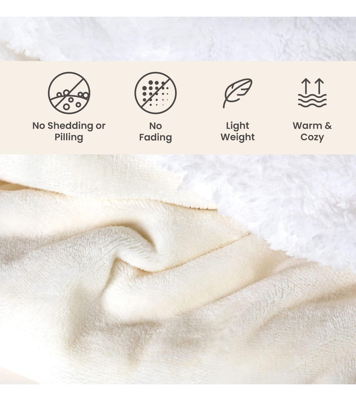 - Eine Seite unserer weichen Kuscheldecke besteht aus dickem, flauschigem Sherpa in traumhaftem Weiß, die andere Seite aus samtweichem Fleece