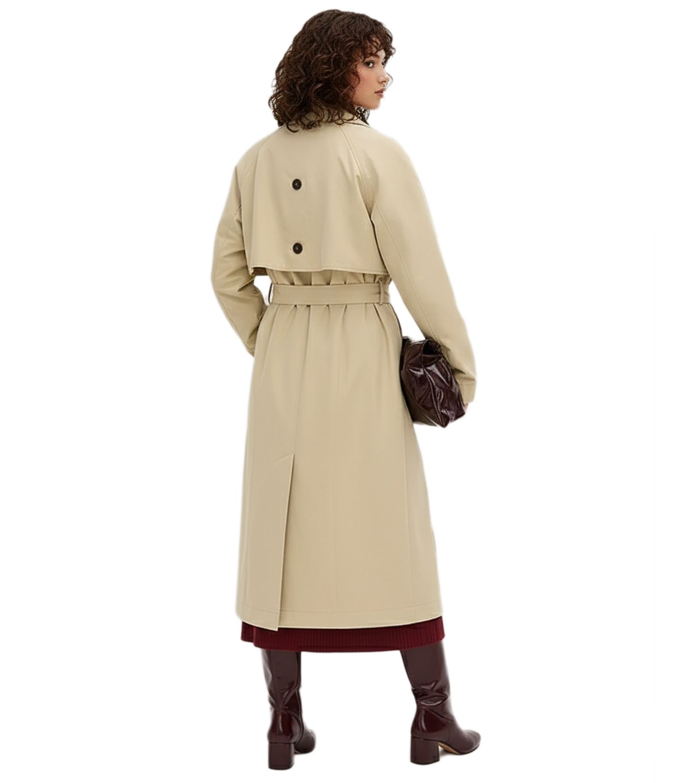 - Der klassische Trenchcoat-Stil wird durch die zweireihige Knopfleiste und die praktischen Taschen aufgewertet