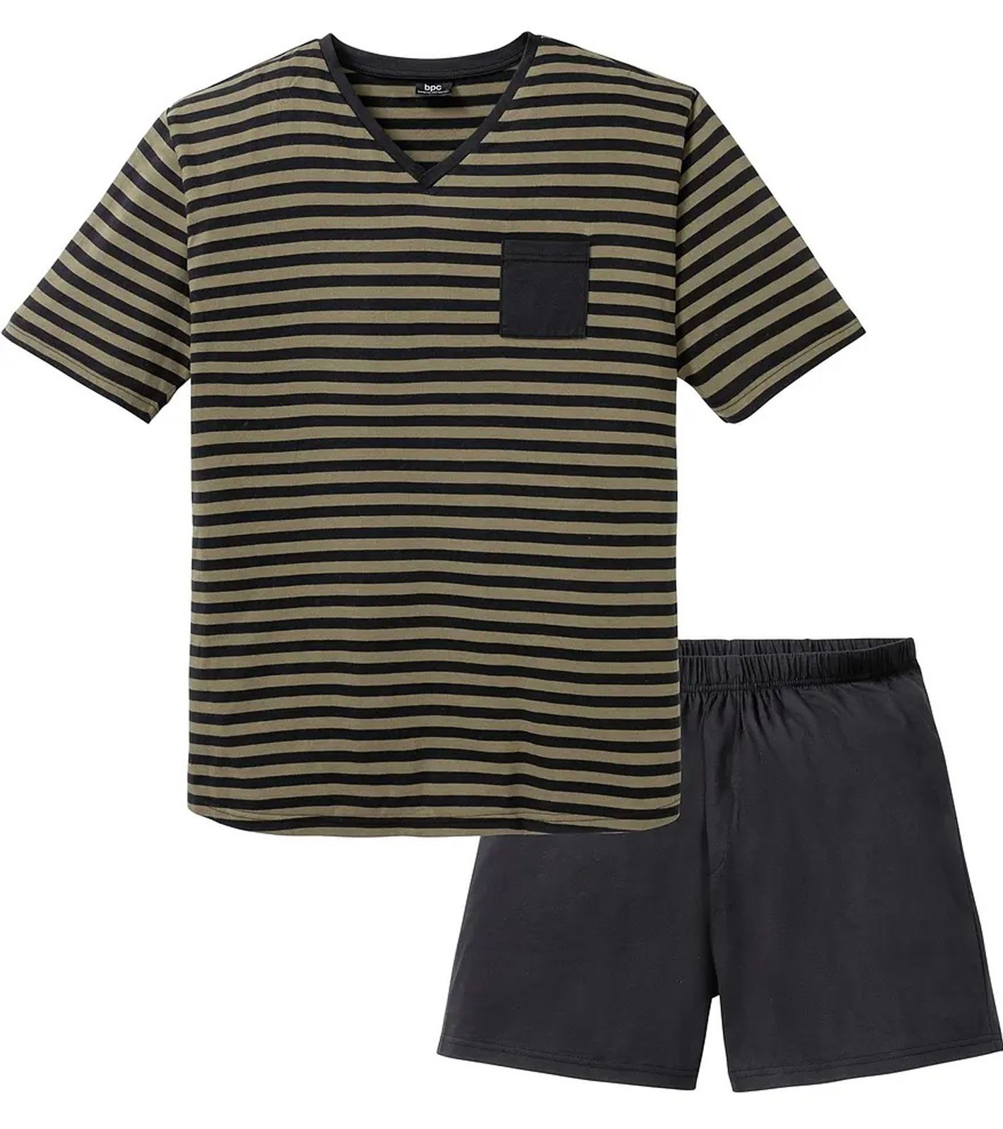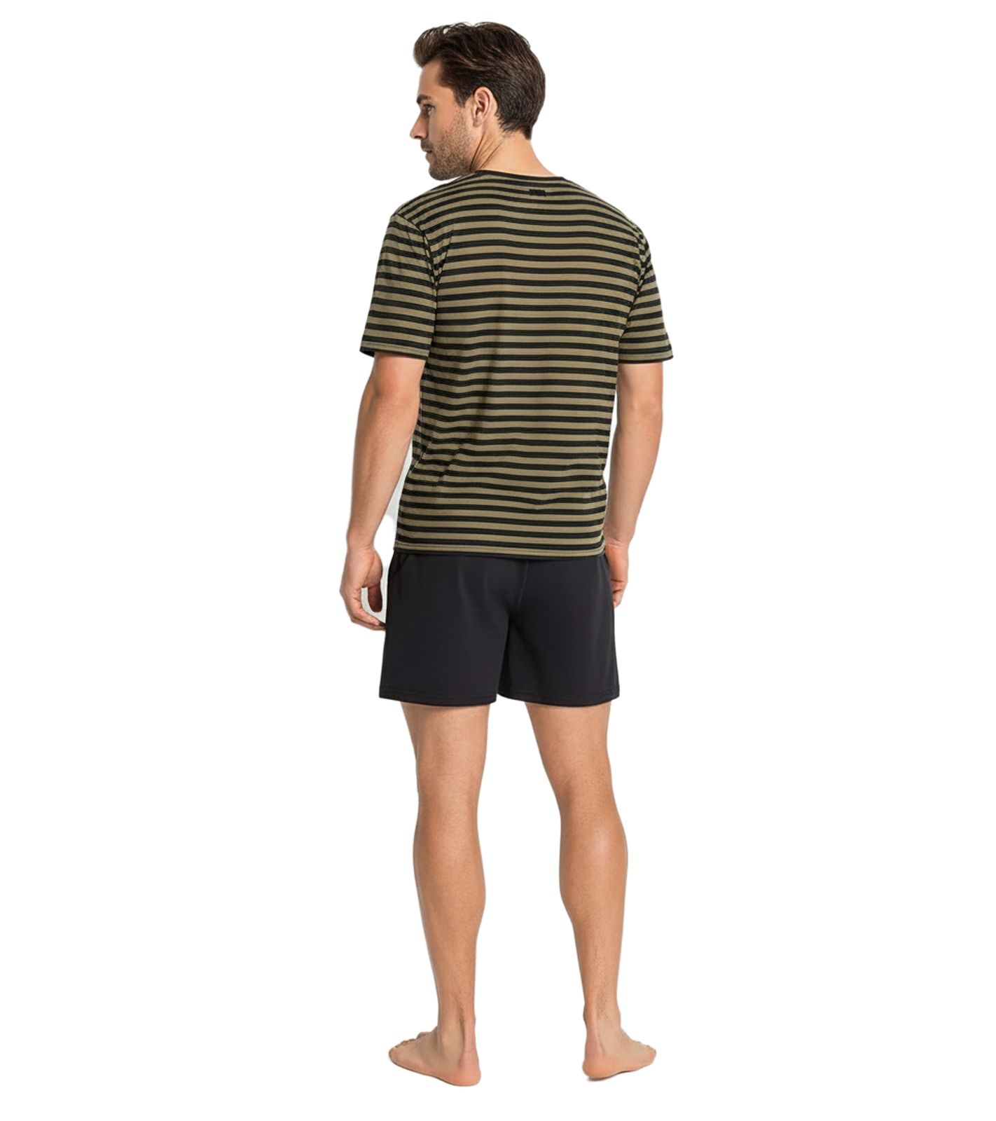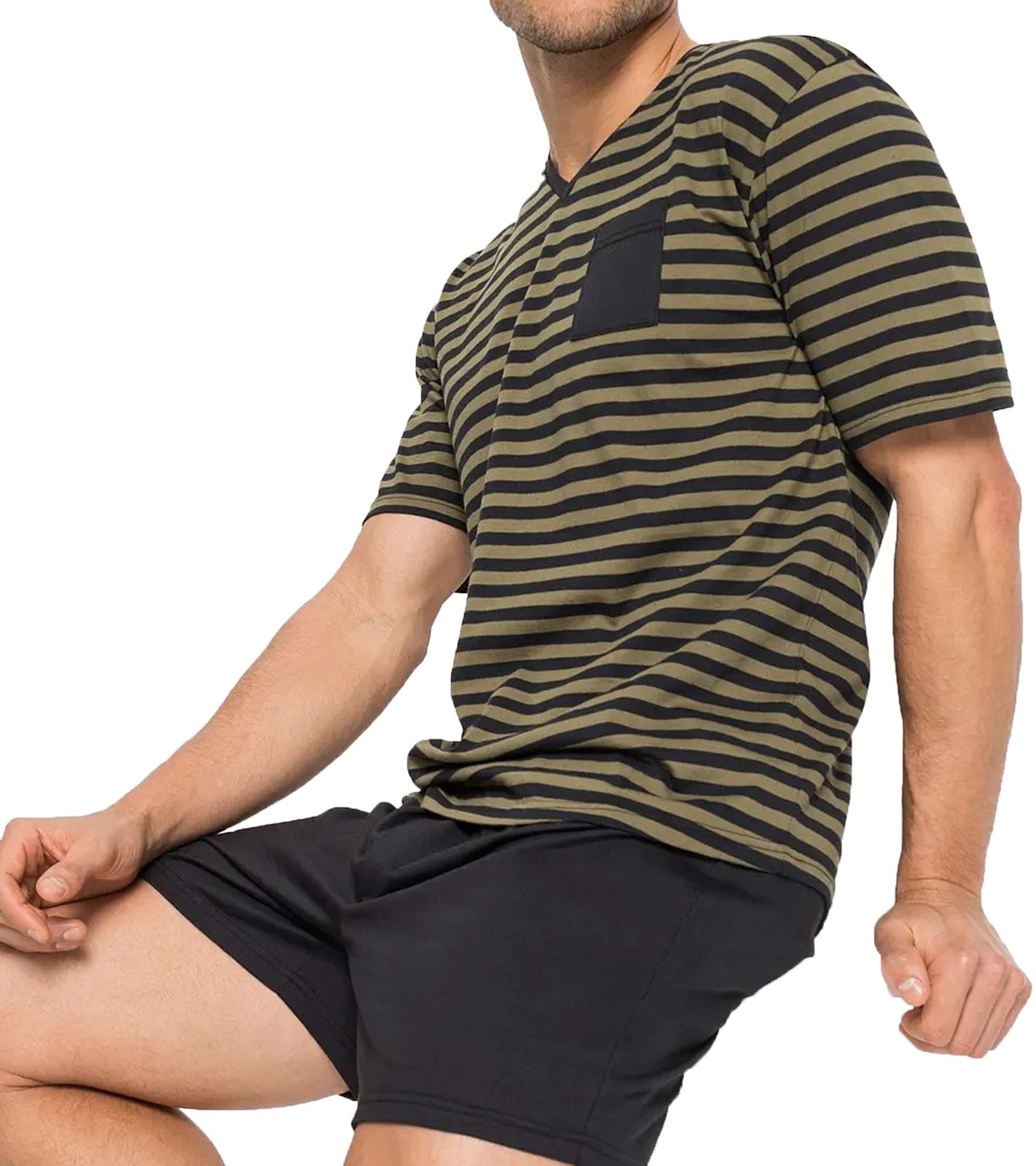 zweiteiliger Herren Pyjama Shorty-Set mit Brusttasche und Streifen kurzer Schlafanzug Baumwoll-Pyjama 957908 Schwarz/Oliv